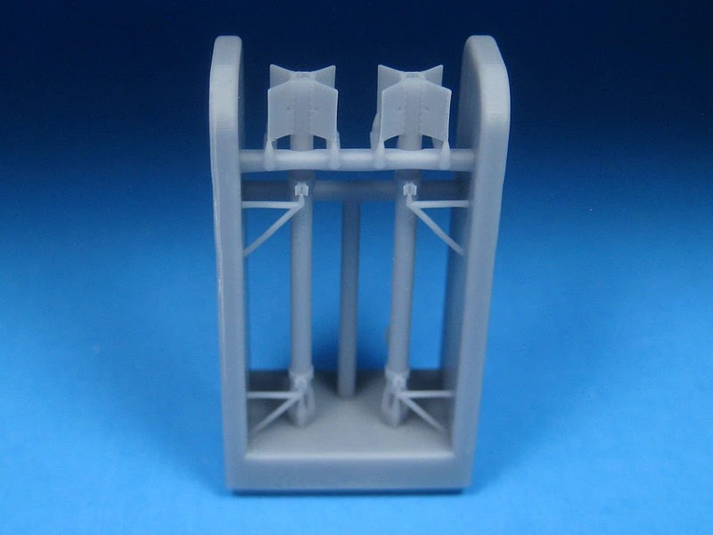 This kit contains 4 super detailed 3D-printed 2-tier rockets with rails as used by Sea Furies, and other a/c. (8 rockets per pair). Rockets and rails have been printed in one piece. The folded metal clips which hold the rockets to the rails do not look solid but rather accurately reflect the gaps between the clips. The 60 lb. The fins and rocket heads have a nice thin texture. Rockets also mounted accurately, the rear clip of the lower rocket attaches to the exhaust, and not the fins as in the kit. For Airfix and Trumpeter kits. CAD By Craig Sargent.