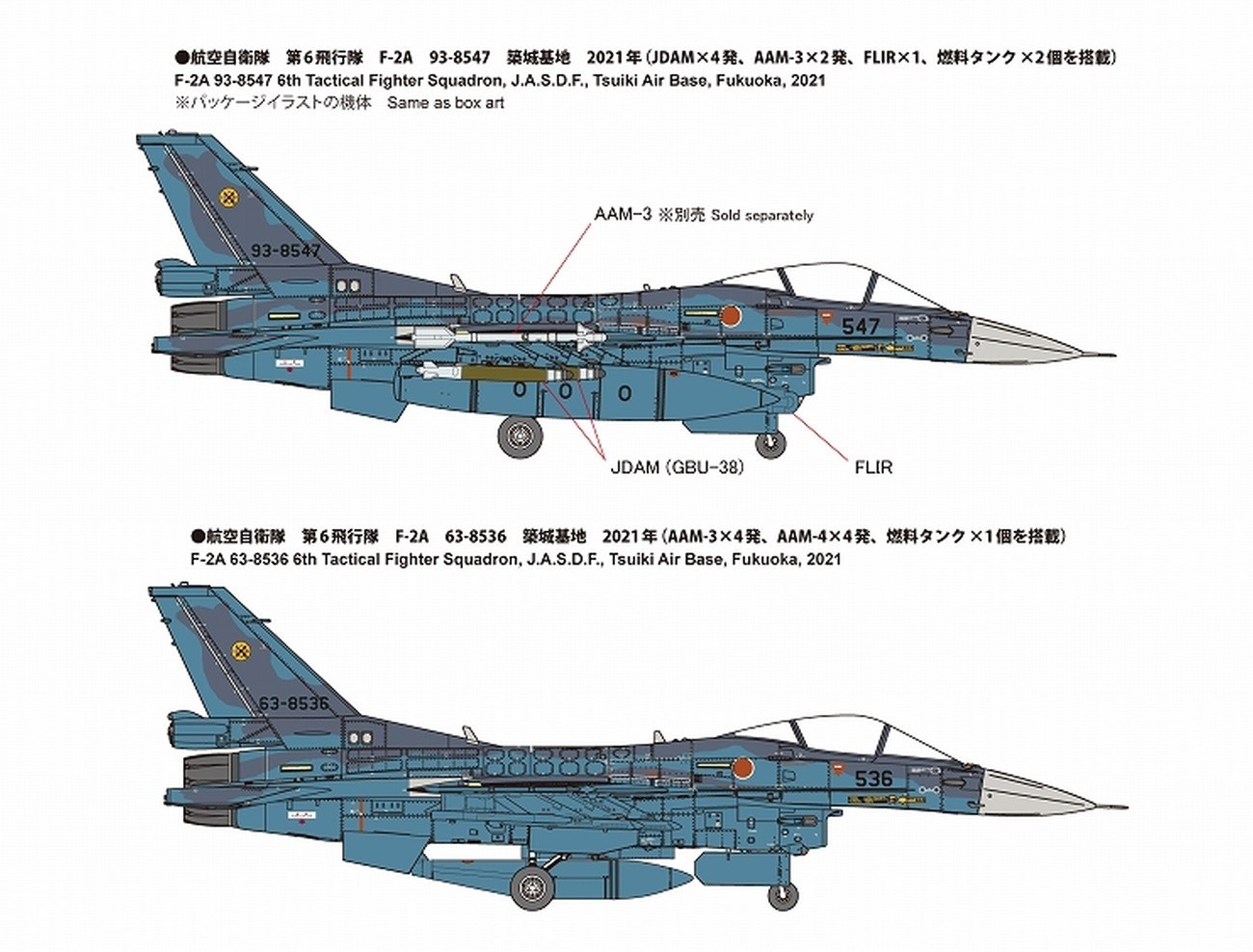 The Japanese Air Self-Defense Force’s F-2 fighter jet was developed as a multi-role fighter that can carry out ground attack missions in addition to anti-ship attacks. JDAM (Joint Direct Attack Munition), a device that adds precision guidance, will be imported as a weapon for the F-2. In addition, it is possible to operate the domestically produced FLIR pod (forward surveillance night vision device) from late production F-2 aircraft. This kit includes four 500-pound bombs (GBU-38) equipped with JDAM, and FLIR pod, Set contains also the main wing outer pylon parts. Limited edition.