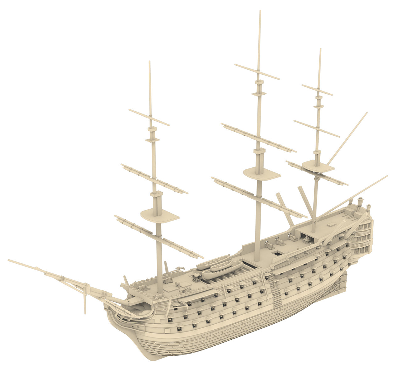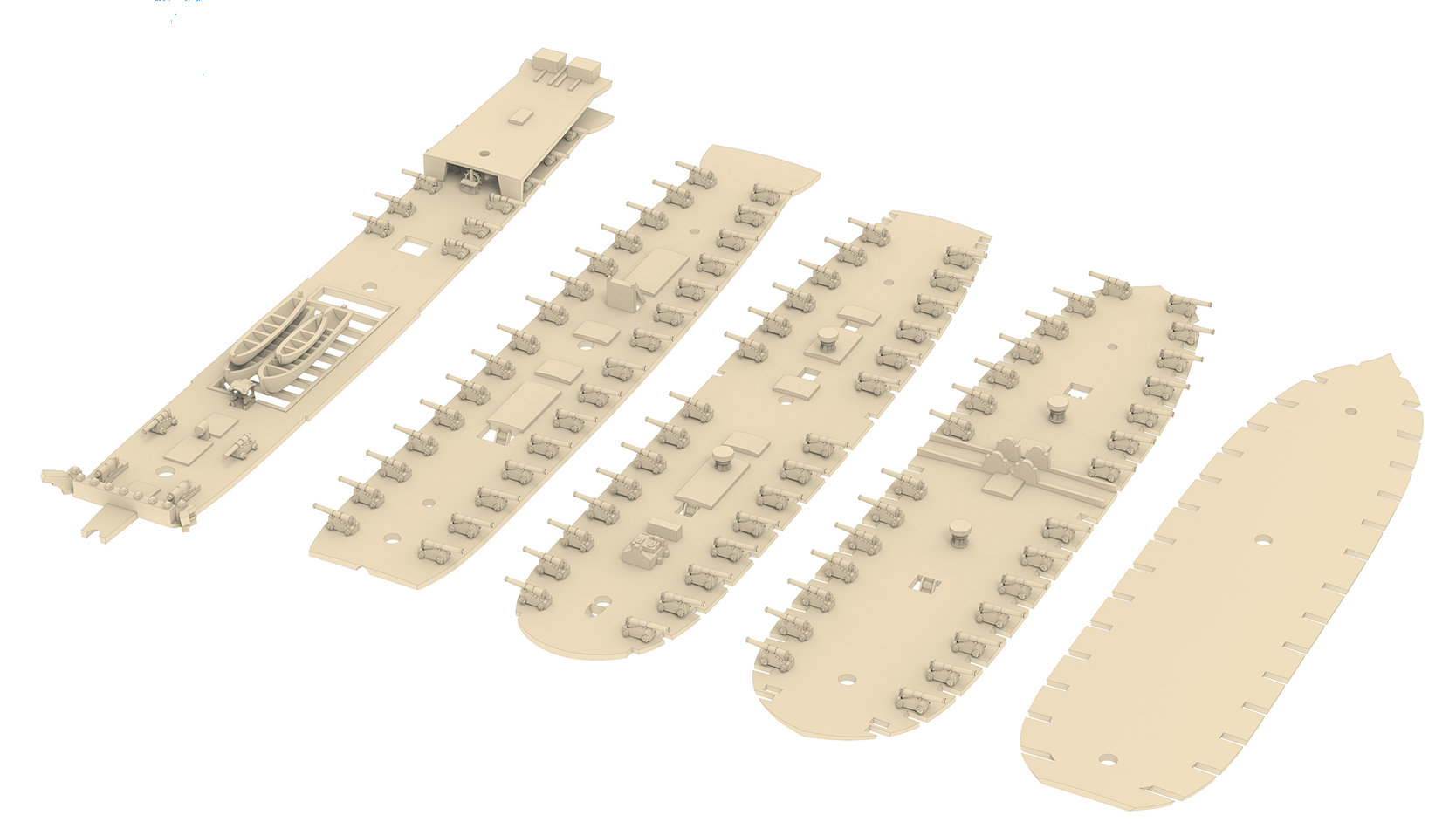 Every cannon on the gun decks & some extras as spares will be included, and most of the gun ports in this kit are depicted open, offering a more complete representation of the 104-guns. Neverland considered using etched ports for the doors, but dismissed it because the production of over 100 would be “maddening”. Even the thickest of etched pieces would be thin. They decided instead to use integrated parts and excellent mould technology, which ensures they accurately depict the robust oak hull of the battleship. The 8K 3D printer was used because they didn’t want to go beyond the limitations of plastic. Each kit will include 3D-printed ship’s wheels, ship’s bells, and two of the Royal Navy’s renowned mortars.