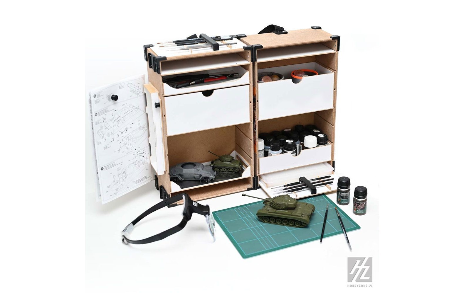 *)24ORGANISATION AND CUSTOMIZATION – a wide range of inserts is available to meet all your needs. Inserts are available that have designated areas for different types of paints and brushes, as well as accessories. This allows you to be organized and efficient. You can easily locate the tools and colors you need by having everything together in one location. This saves time while enhancing your painting experience. You can design a Hobby Station that is tailored to meet your specific needs. (*