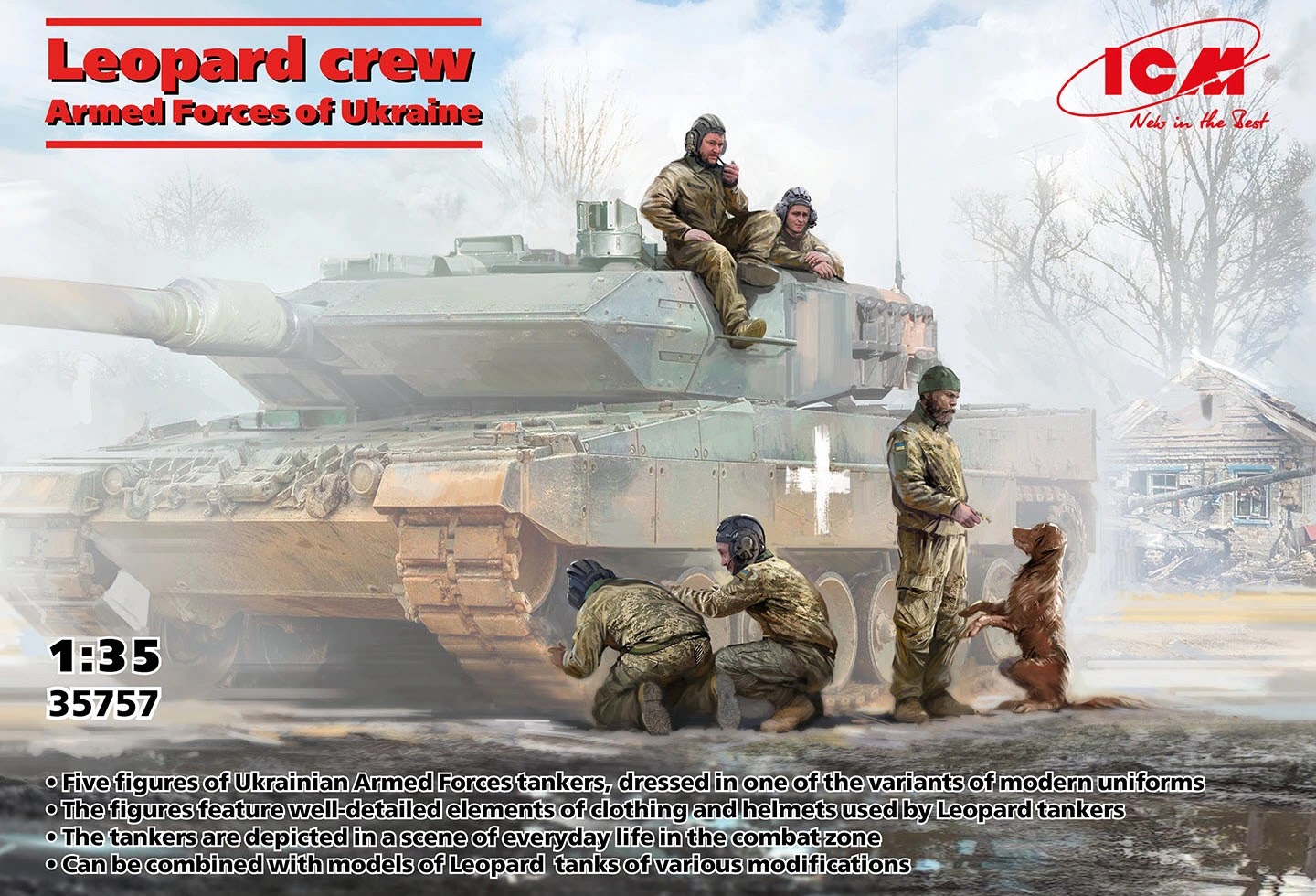 in their units by spring 2023. These tanks are active in battles that take place in Ukraine’s east and north-east. In combat, the tanks of Ukraine are also marked by crosses in various forms. Leopard 2A6 has proven to be an efficient tool against the enemy tank. In particular, the successful encounter with T-80BVM tanks was recorded. The kit has not yet been released, only its boxart. We do know that there are 291 pieces on 12 sprues, all in gray plastic. This is all we know about this kit so far…These new kits will also be available from ICM in July (22nd)…-1/35 Leopard crew of the Armed Forces of Ukraine
