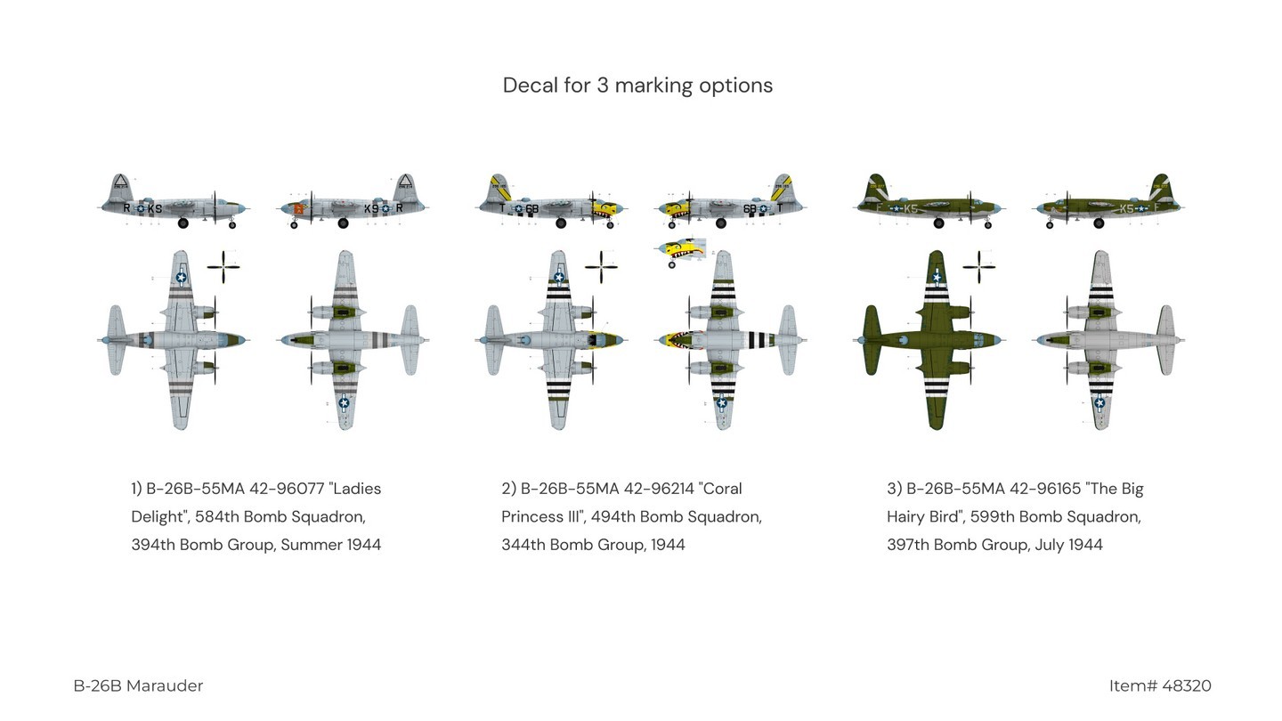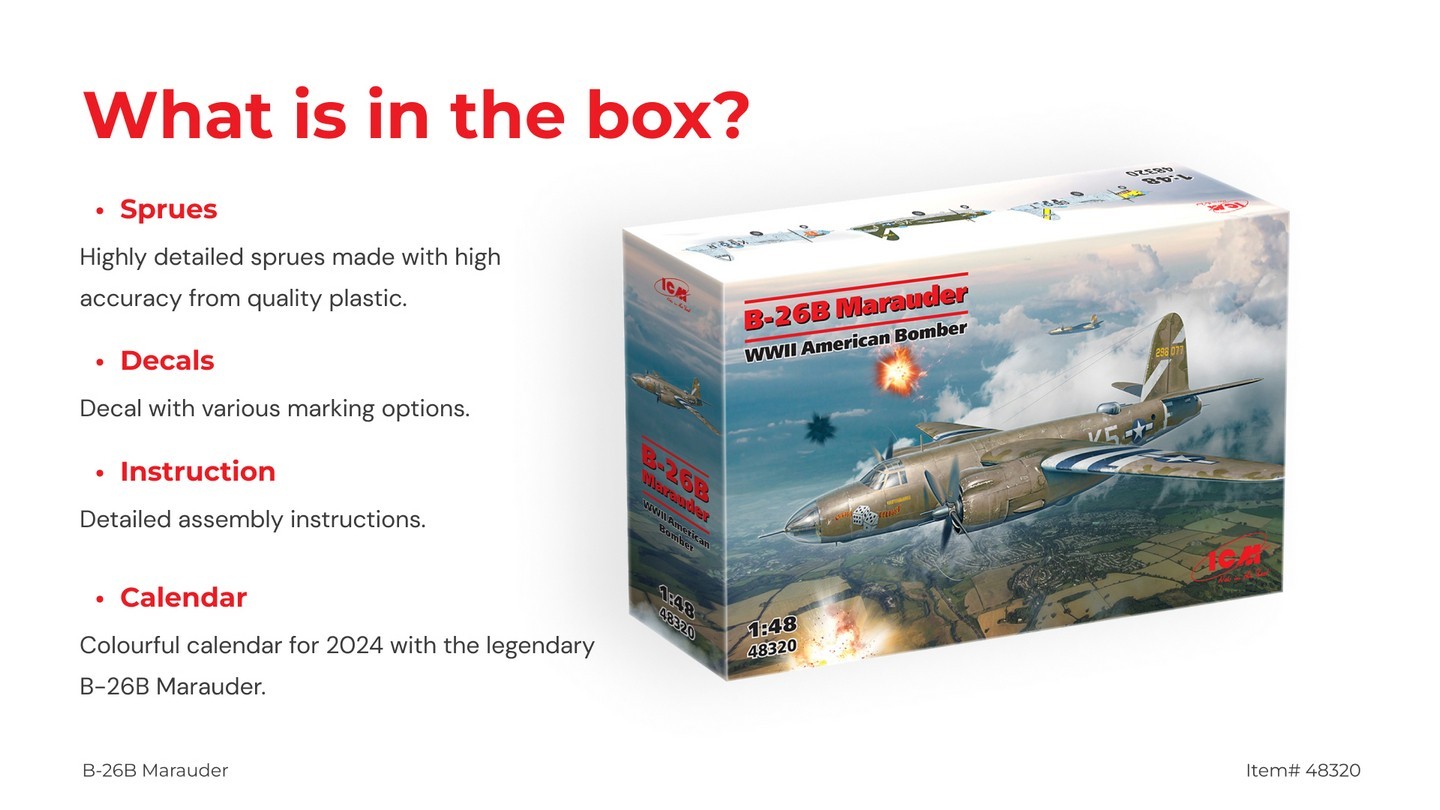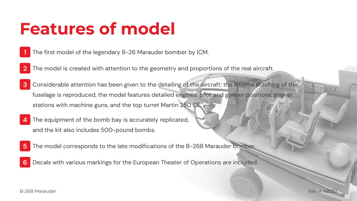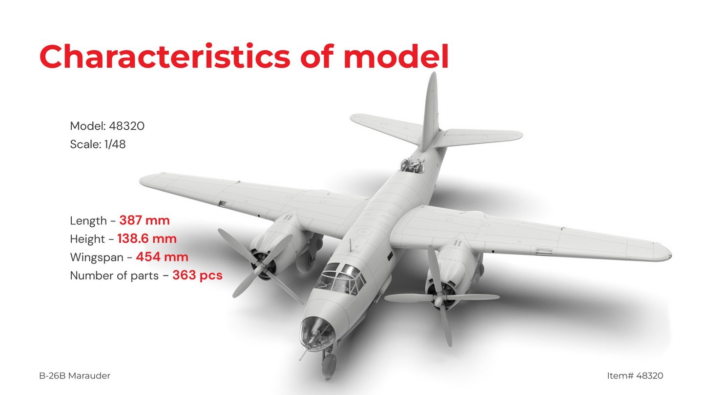 ICM is releasing the B-26B Marauder in 1/48 this month. You can watch for further details, but in the meantime you can see the information about this kit on the pictures below.