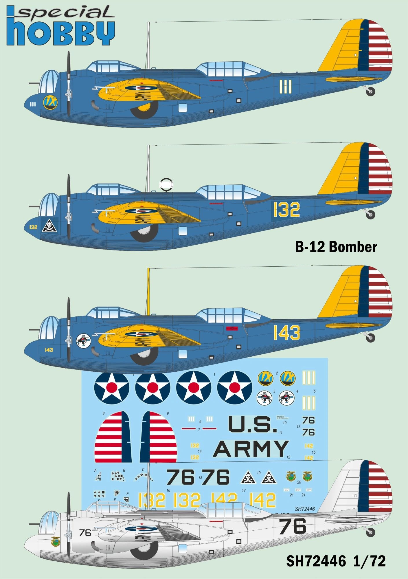 . The Martin Company revolutionized aircraft design when it introduced its B-10, B-12, and B-14 bomber families. A metal monoplane with closed cockpits, and engine cowlings completely concealed, appeared in the 1930s, when biplanes covered by fabric ruled the sky. These new aeroplanes were not only faster than the other bombers at the time but they also outpaced the fighter types. This, in turn, led to the development of monoplane fighters. Aeroplanes were designed with a new concept that required major changes around the world. Both of these are included in our model kit. Kit includes four aircraft, with three painted in blue and white, while the fourth is in aluminum dope. The aircraft portrayed differ by the bomber unit insignias.