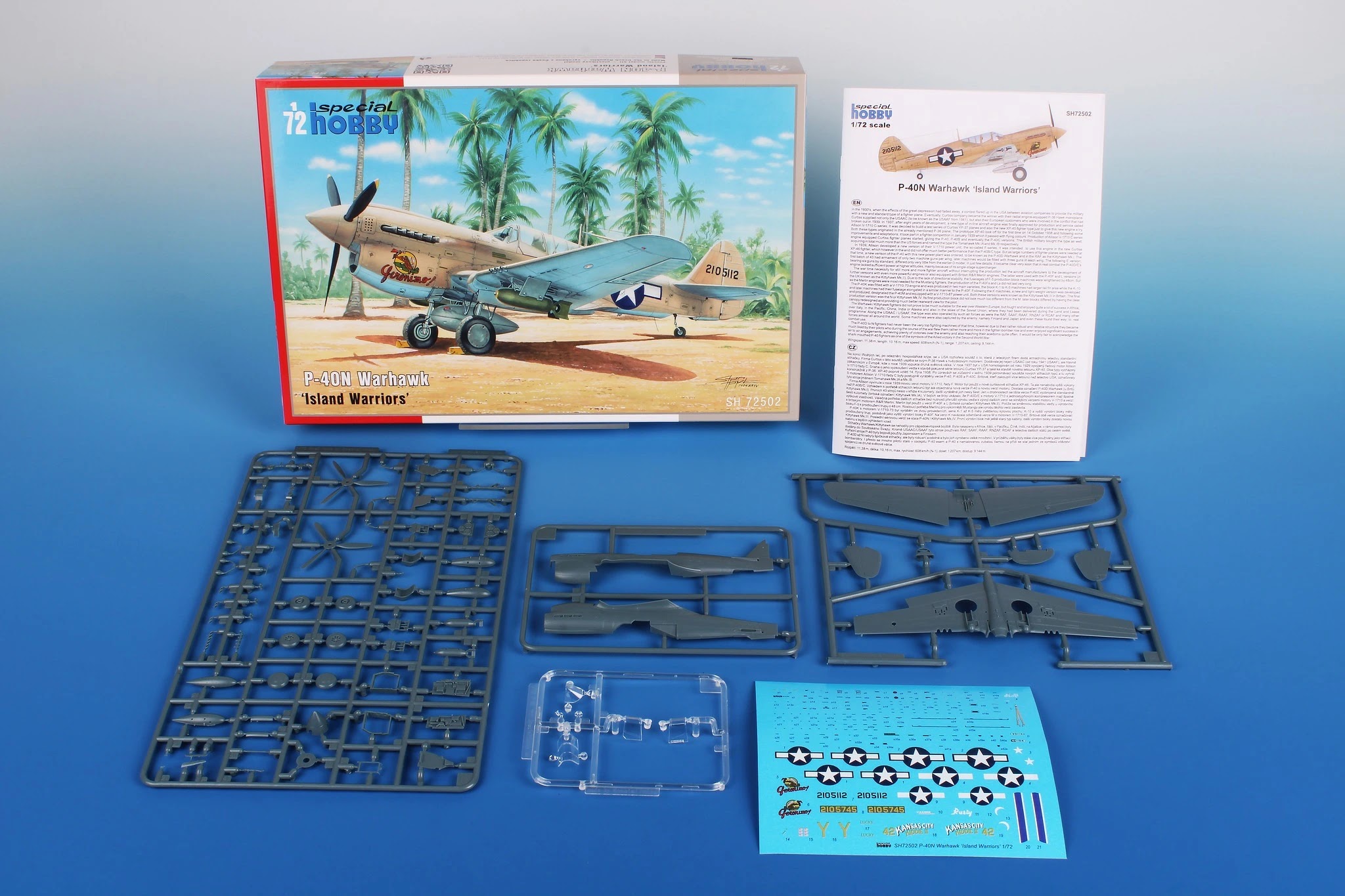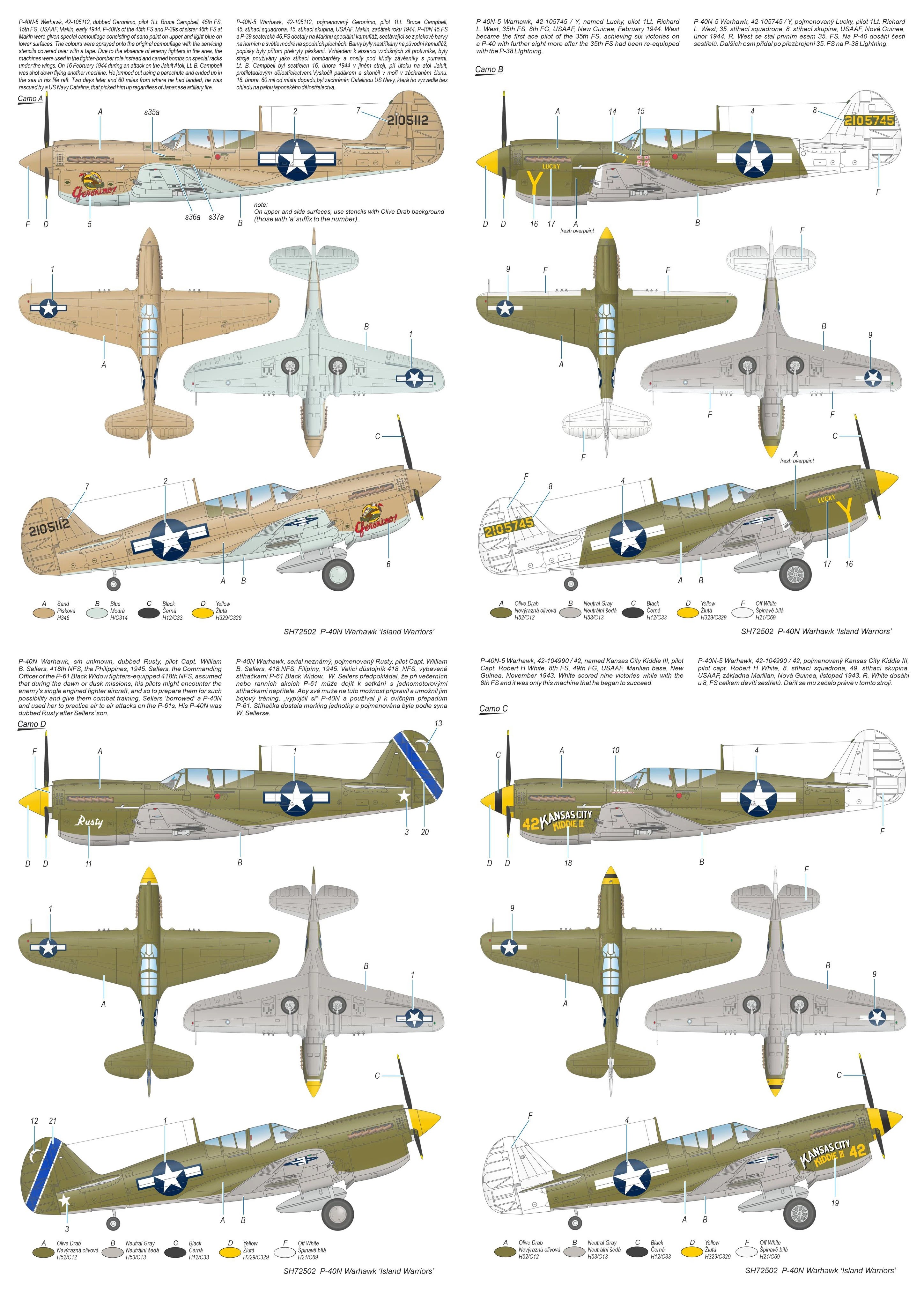 The P-40 US-built fighter aeroplane is one of the very iconic types of the war and was also supplied to the Allies, named the Kittyhawk. In US colors, the P-40N is considered to be the last production version. It was mainly used over China and India as well as Pacific battlefields. The machines were assigned to different units and wore various markings that referred to their squadron. The Pacific Island-based aircraft were painted in sand, which was more appropriate for the location of their deployment. The two chosen schemes were sand and light blue while the remaining two used the standard Olive Drab/Neutral Gray scheme. All four aircraft have colourful and eye-catching markings.