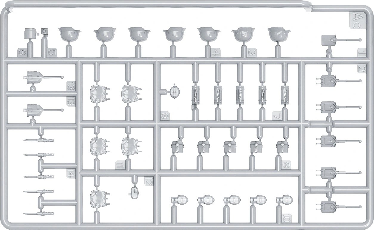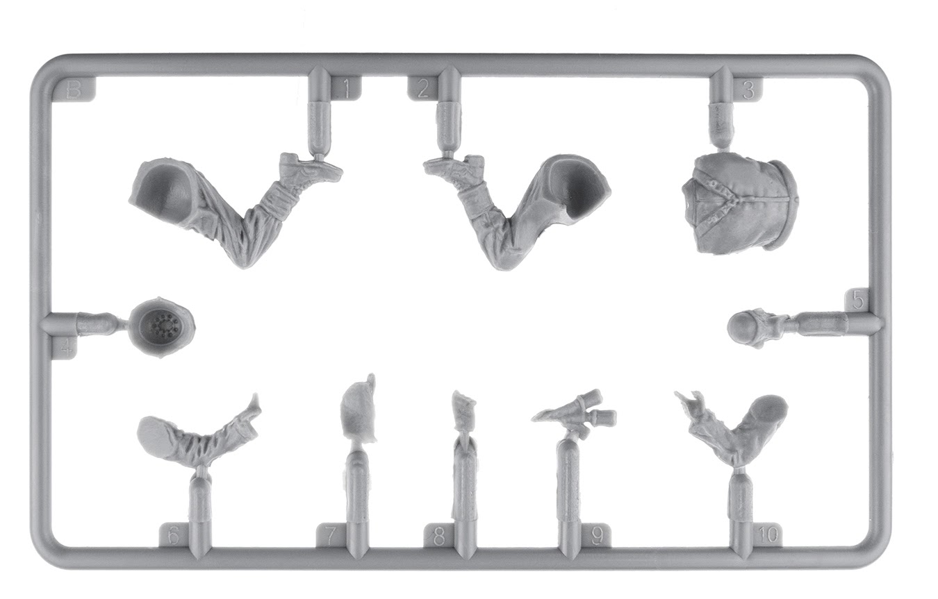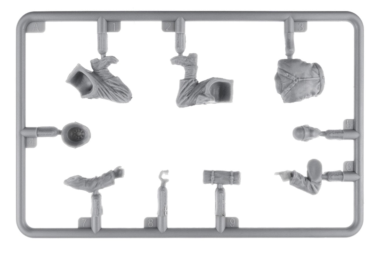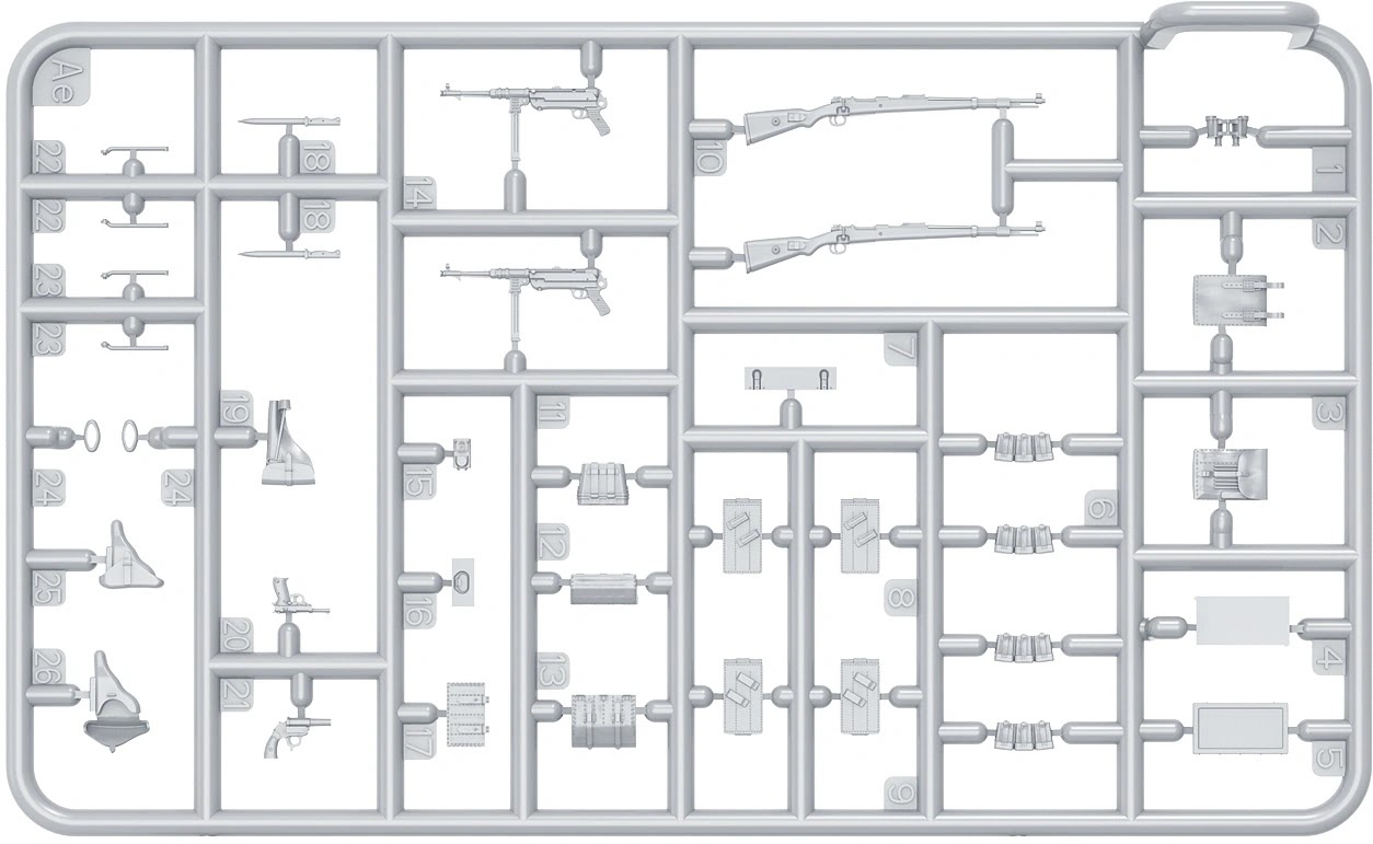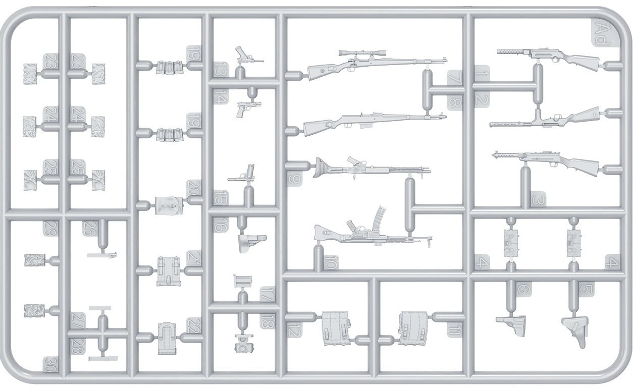This set will look familiar to a lot of you as it was originall released in 2022 – but this set includes improved resin heads for that extr bit of nice dtail to the set. The MiniArt sets now include new resin heads. This set will look familiar to many of you as it was originally released in 2022. However, this version includes improved resin heads for that extra bit of detail. We will have to make them up for you when they come out! We will have to make them up for you when they come out!01001010There is also a sprue of various German weapons of the era, the Kar.98, Mp-40, a Walther pistol, holstered pistols, map cases, ammo pouches, a bayonet and even a flare gun!01001010M1943 helmets, bread bags, bayonets, an entrenching tool, flasks and gas mask canisters are also included in a vast array of gear.01001010Not wanting to leave anything out, the MG 42 7.92x57mm Mauser general-purpose machine gun with ammo belt, bipod and gear is also included.01001010This kit will be released next month.01001010