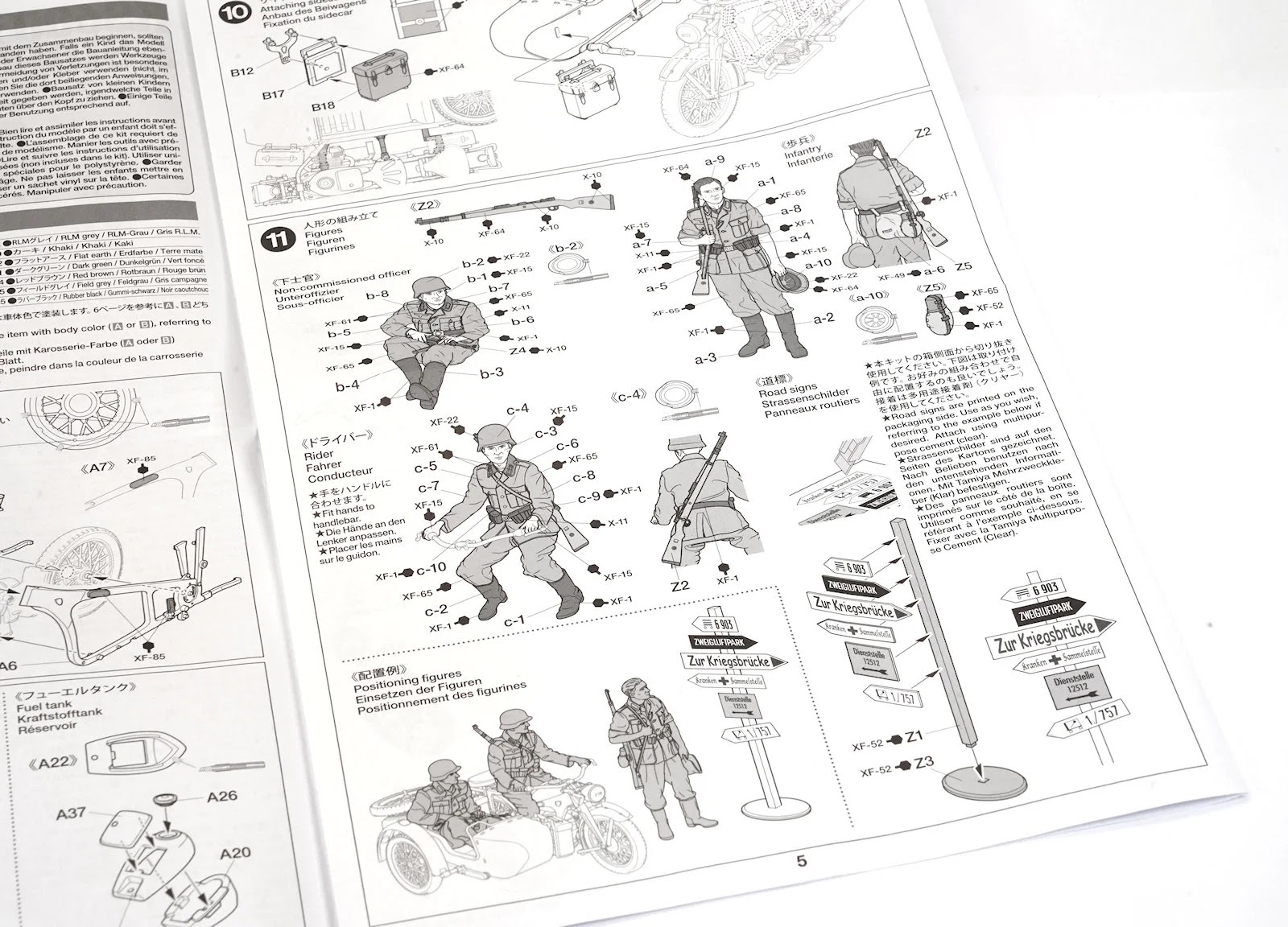 The kit promises a signpost with a few road signs, but I was a little disappointed to see the road signs needed to be just cut out of the side of the cardboard box. I’d recently reviewed the MiniArt kit of German road signs and was hoping Tamiya may have followed suit with the moulded timber blades overlaid with full colour decals…but that was not to be.