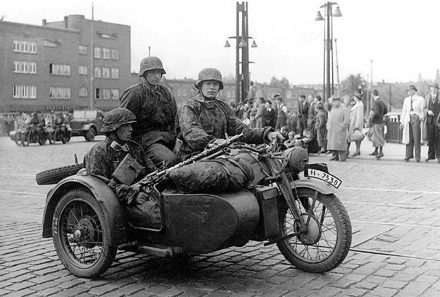 German soldiers of the Leibstandarte SS Adolf Hitler on a Zundapp type KS 600 motorcycle in Berlagebrug, in Amsterdam, Netherlands.