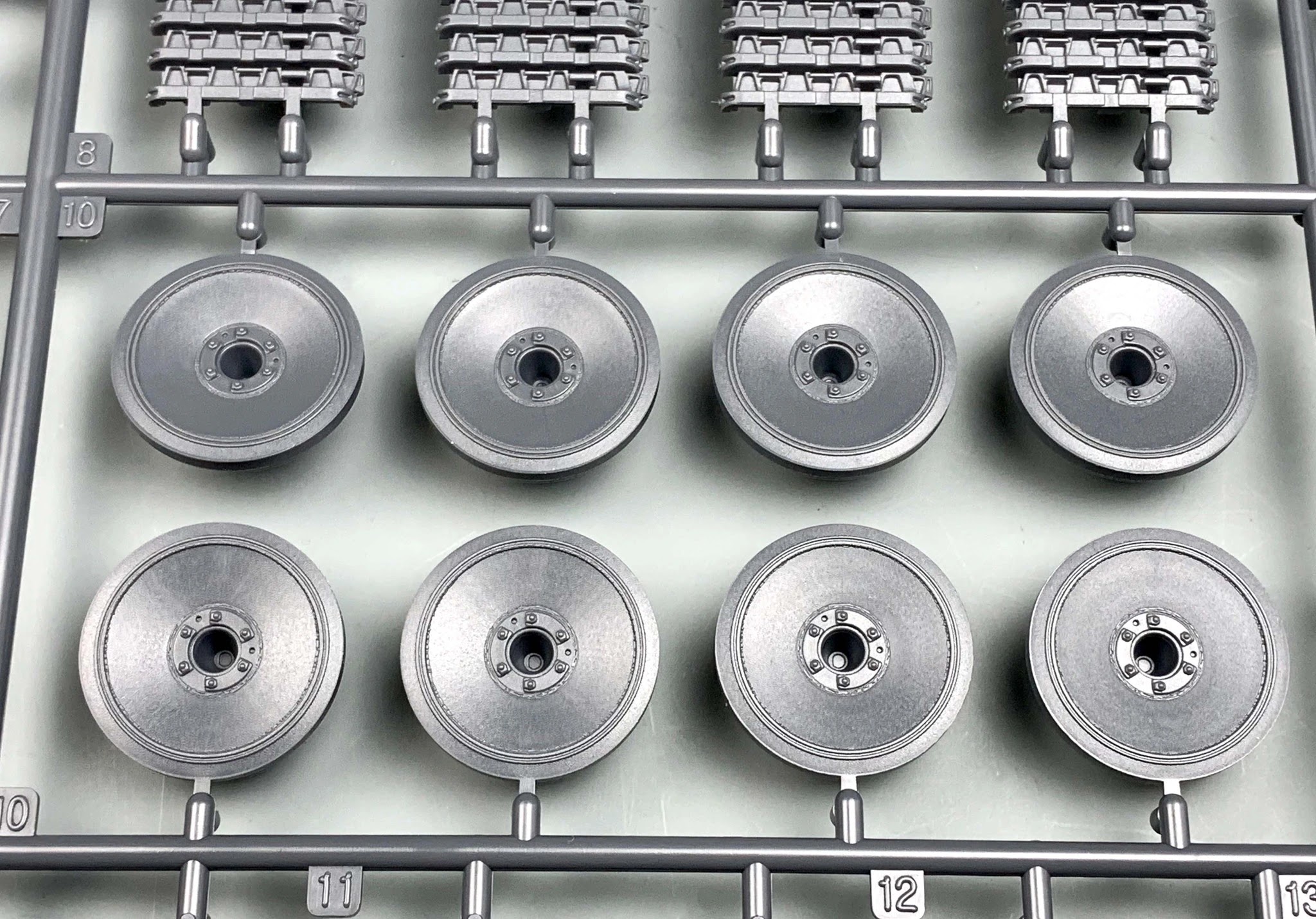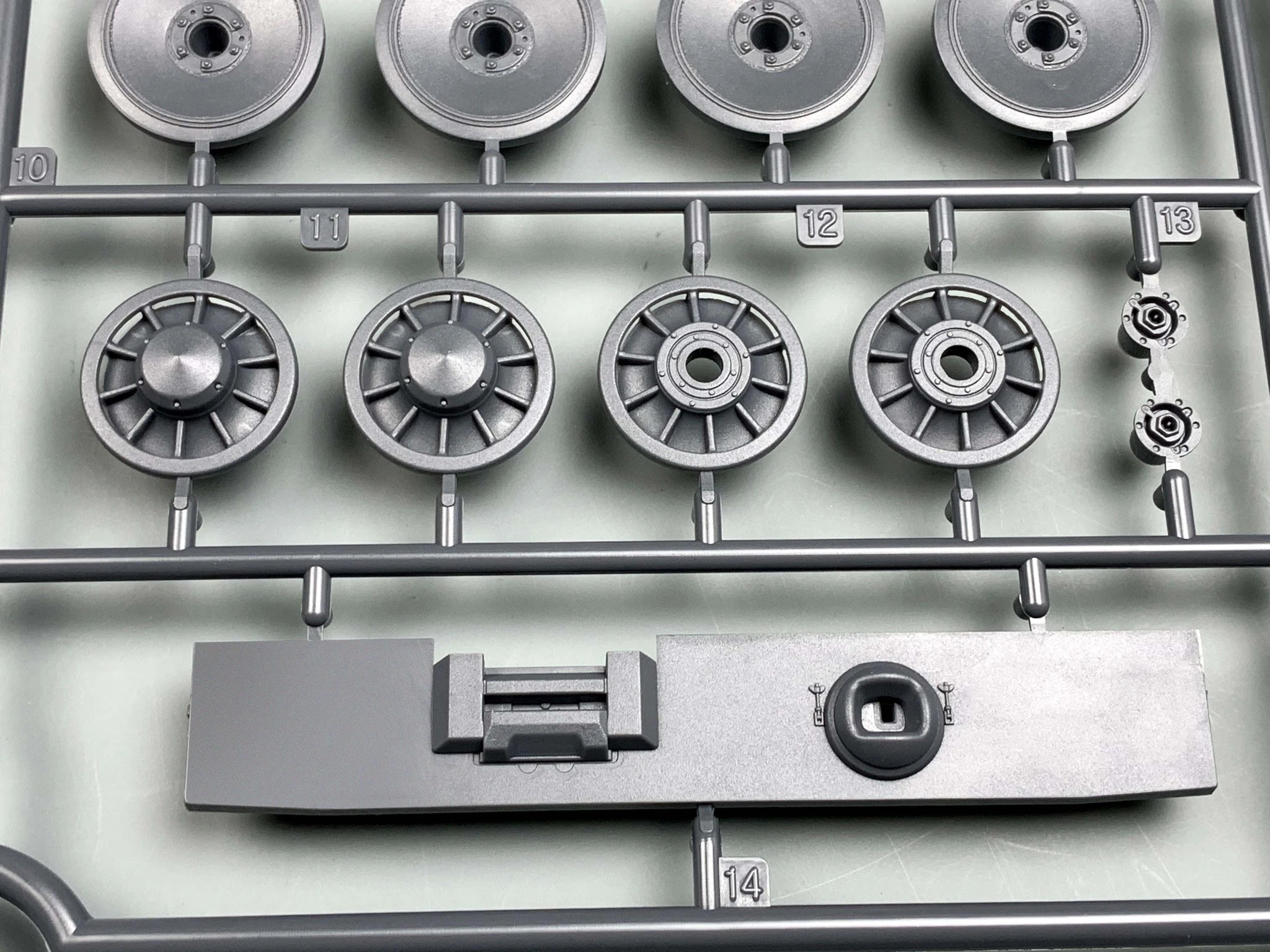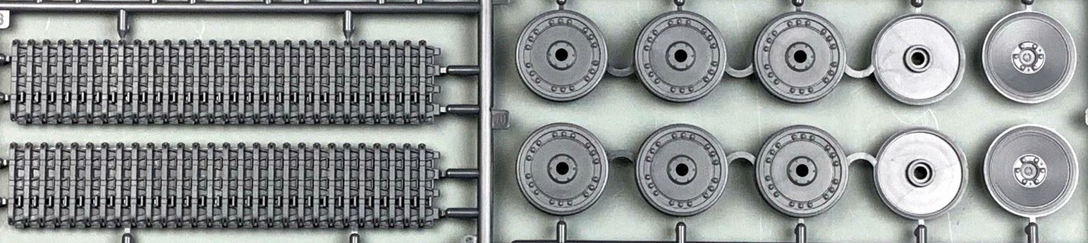 Speaking of moulded on – the roadwheels are moulded with loops in them to capture the other rows of roadwheels on to. It’s a strange design that limits the possibilities of the modeller. It will be a nightmare for more experienced modellers to remove these tools. The kit includes poly caps, but they are not necessary for a kit with no turning wheels. )
