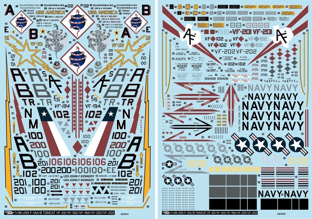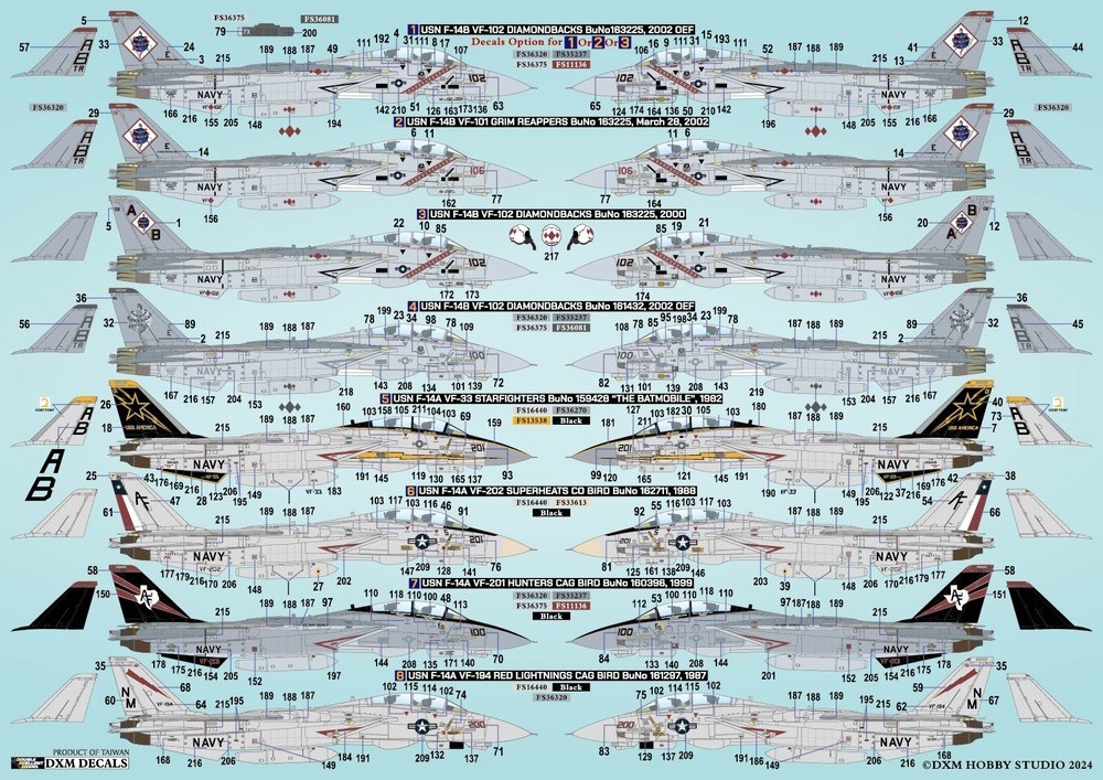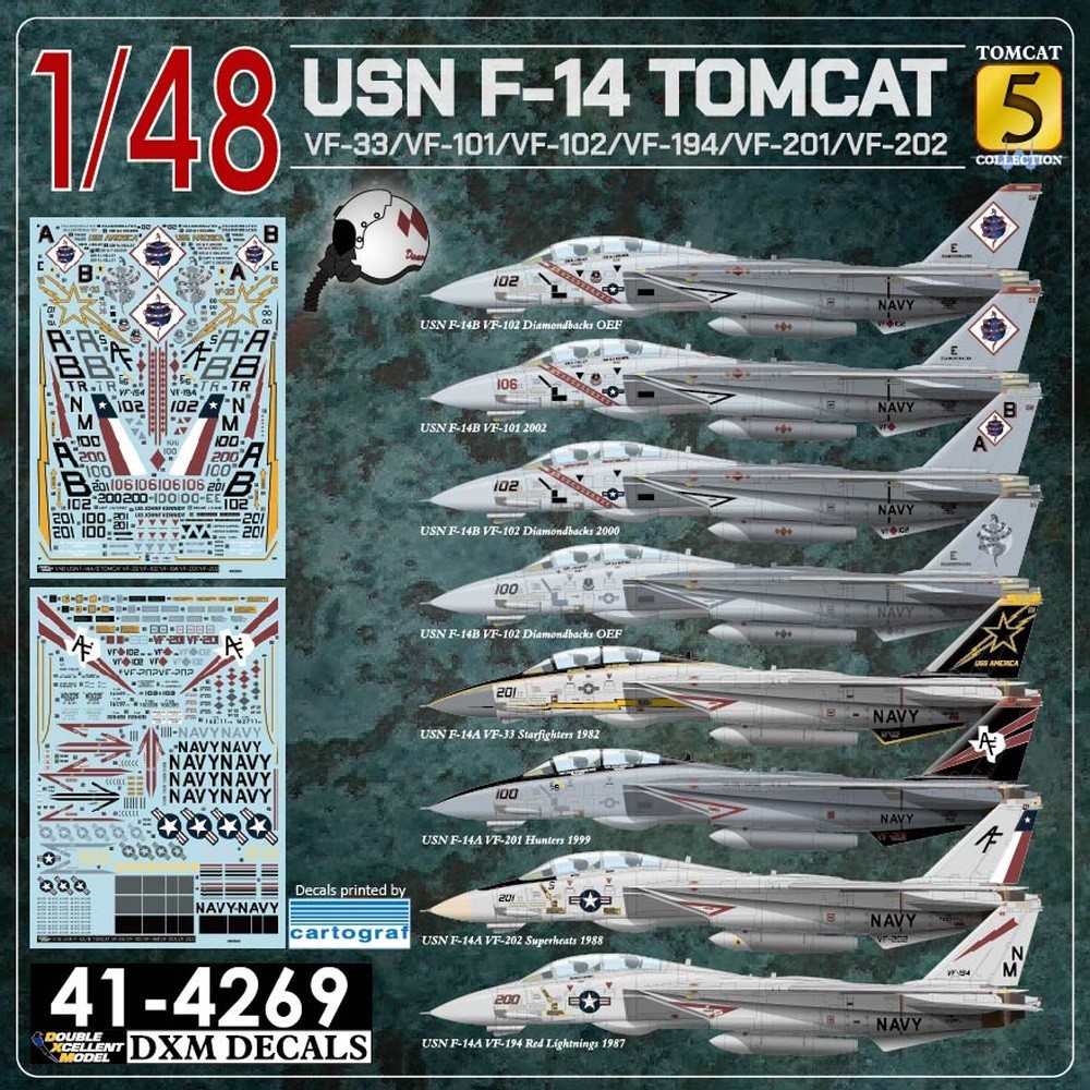 Double Excellent Models [DXM] F-14A/B Decal Collection 5 in 1:48 Scale featuring Tomcats of VF-194, VF-194, VF-20, VF-24, VF-22, VF-3, VF-194, VF-24, VF-2, VF-30, VF-3, VF-21, VF-212, VF-220, VF-223, VF-194, VF-234, VF-234, VF-238, VF-237, VF-191, VF-33, VF33, VF 101, VF-33, VF VF-101 and VF-1, a decal collection 5, Double excellent
