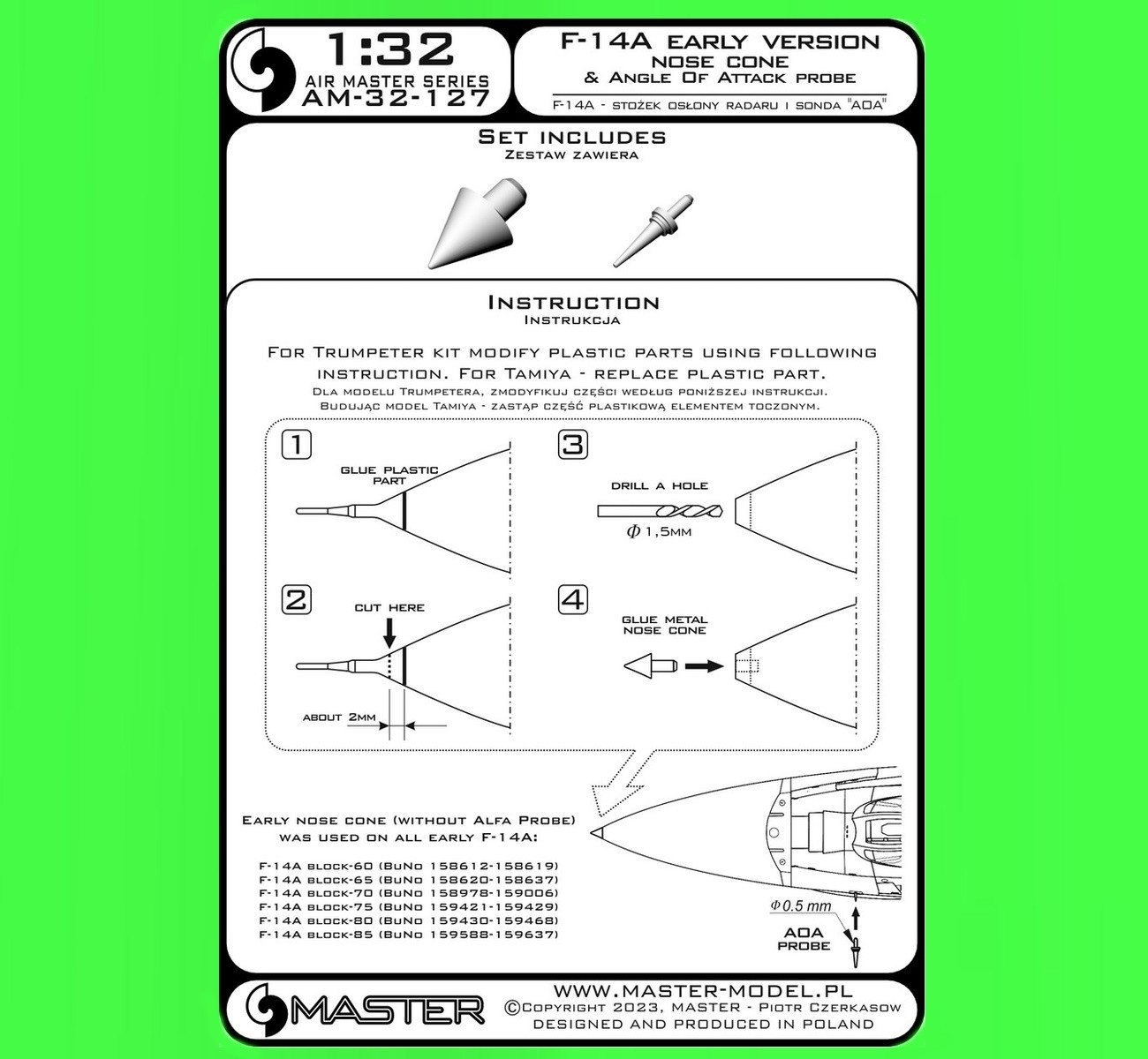 “First new set in the 1/32 scale – MASTER AM-32-127 for early version F-14A’s with the nose cone without the Alfa Probe. This is suitable, when You build model of Tomcat from the very early  production blocks -up to Block 85”…………………………………Master