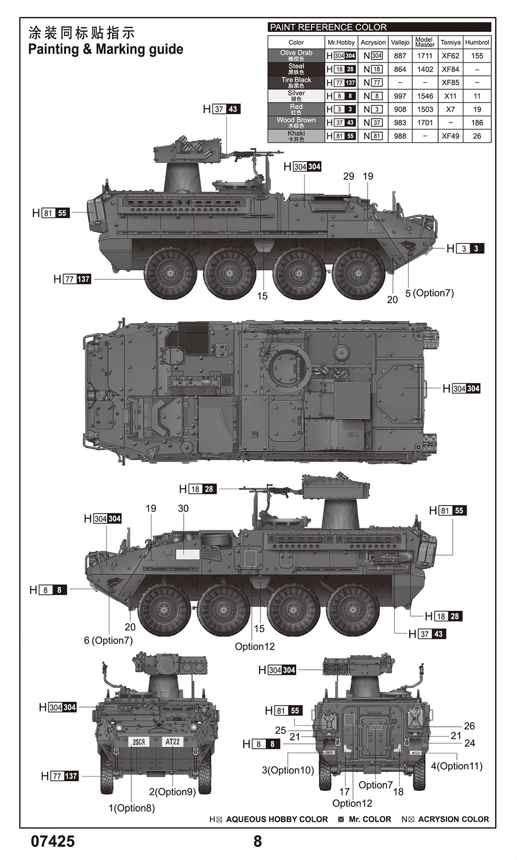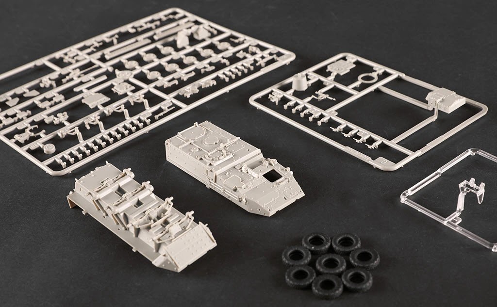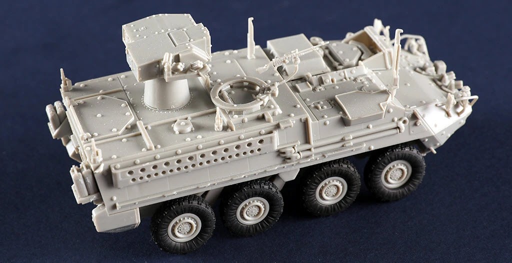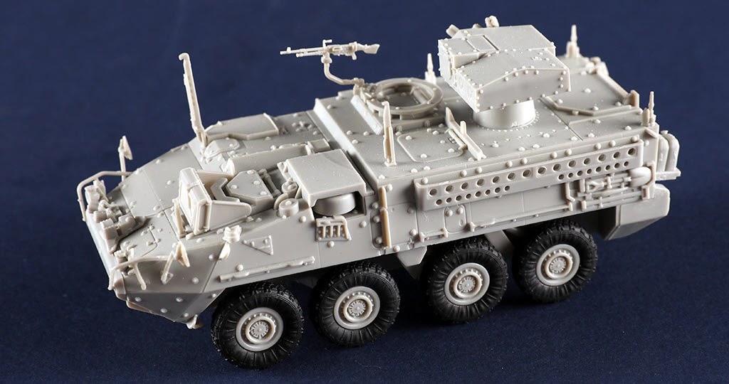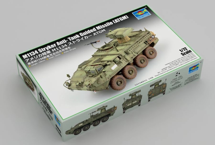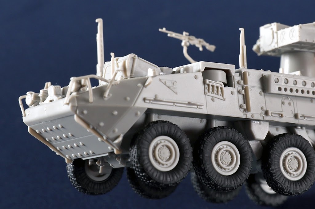 The M1134 Stryker Anti-Tank Guided Missile Vehicle is provided with and elevated TOW system and is able to fire TOW anti-tank missiles. ATGM weapons give TOW capability to infantry fighting vehicle. This ATGM system features a two-tube launcher with a mast that extends 0.5 metres above the chassis. The decals included with the kit
