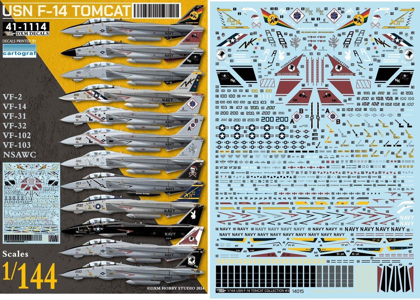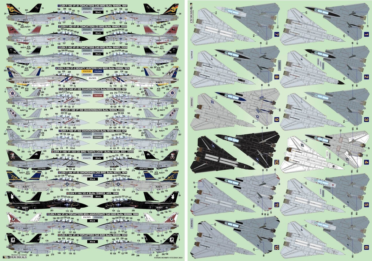 Available Now 1/144 USN F-14A/B/D Tomcat VF-2/14/31/32/102/103/NSAWC collection decals set, available for 12 schemes.