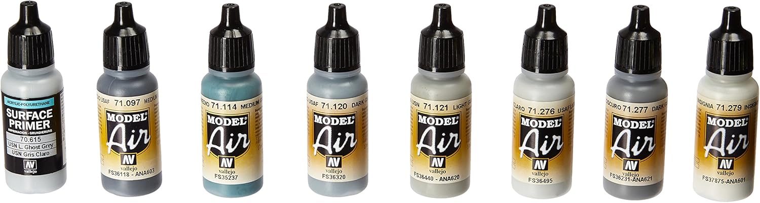 The sets is developed to paint the color schemes of most of the us Navy and USMC aircraft in service the seventies to the present. The set includes the colors for the air plane profiles and camouflage patterns drawn by mark Rolfe. With the collaboration of "piece a piece. Colors 70.615 light Ghost gray 71.097 Medium gunship gray 71.114 Medium gray 71.120 dark Ghost gray 71.121 light gull gray 71.276 USAF light gray 71.277 dark gull gray 71.279 insignia white.