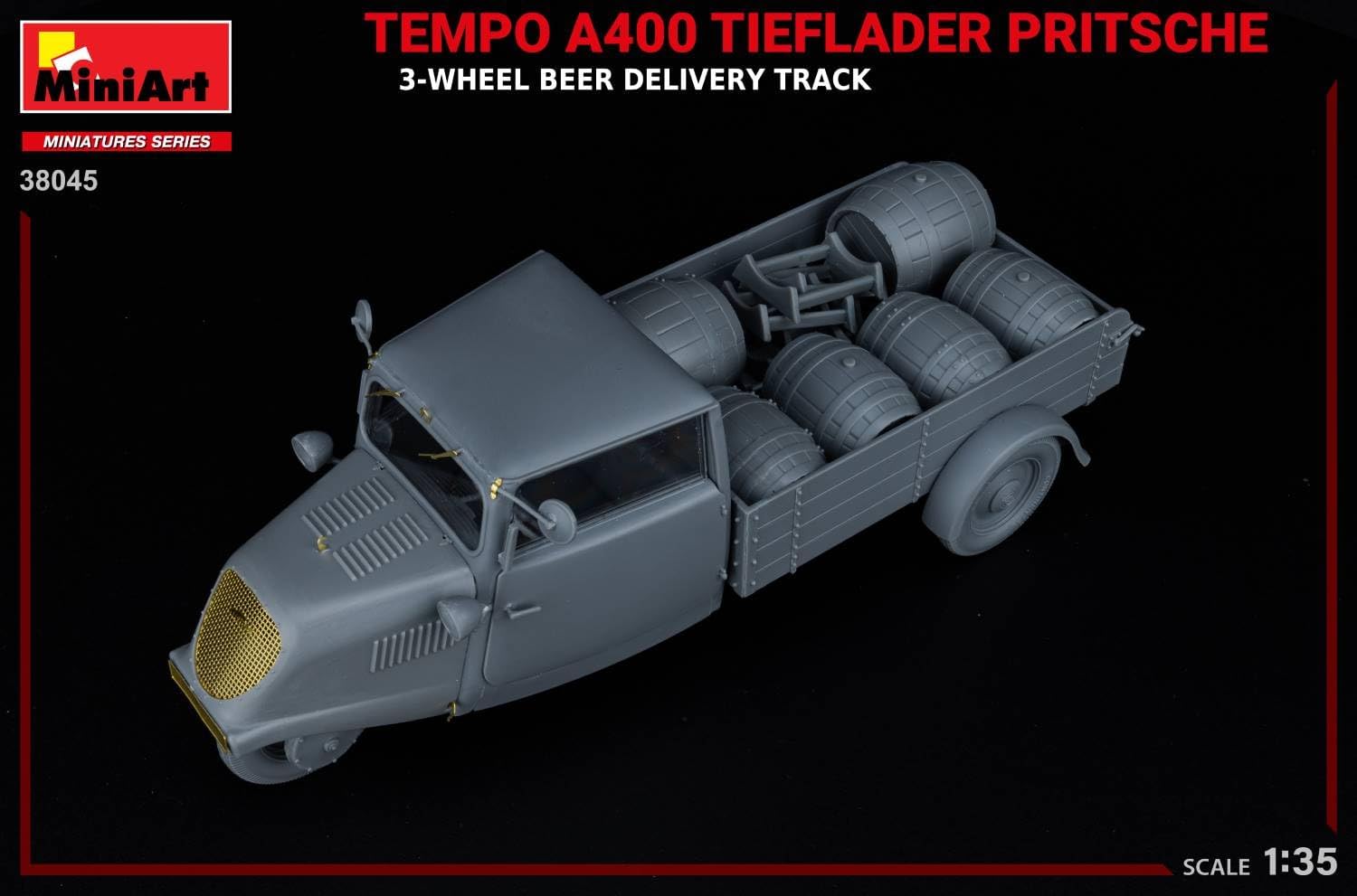 Kit camion per la consegna di birra a pianale ribassato a 3 ruote Tempo A400 in scala 1/35 – Modello Miniart.- KIT MODELLINO IN PLASTICA ALTAMENTE DETTAGLIATO – PARTI IN PLASTICA TRASPARENTI INCLUSE- PARTI PHOTOINCISE INCLUSE- PARTI PHOTOINCISE INCLUSE- PARTI PHOTOINCISE INCLUSE- USE- LE BARREL ILI SONO INCLUSE- FOGLIO DECAL PER 3 OPZIONI- LE PORTE POSSONO ESSERE MONTATE IN POSIZIONE APERTA O CHIUSA