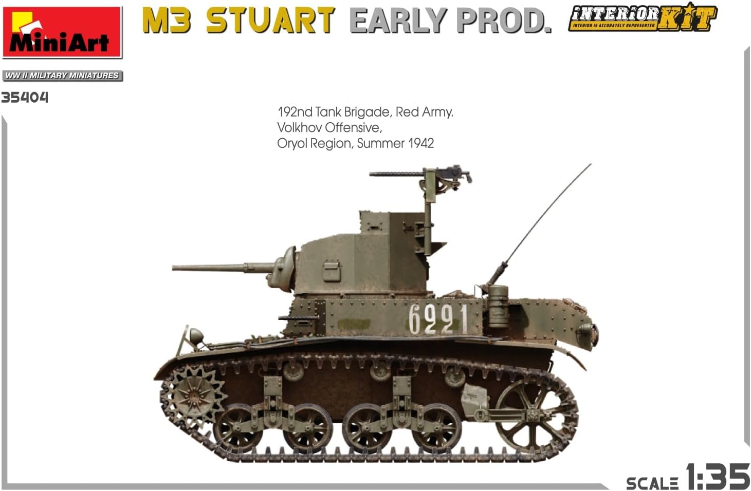 The standing model reproduces an early M3 Stuart tank in 1:35 size. The photo-etched parts and the open/closed hatches can be displayed in a diorama, along with the moving chain links. The tank is available in seven different variations, thanks to the decals and welded seams. This allows you to create a diorama that’s unique. In addition to the detailed appearance, attention was also paid to a faithful reproduction of the interior.ModelDetailed model kit from Mini Art in scale 1:35.The high-quality and detailed kit from Mini Art must be assembled by yourself.