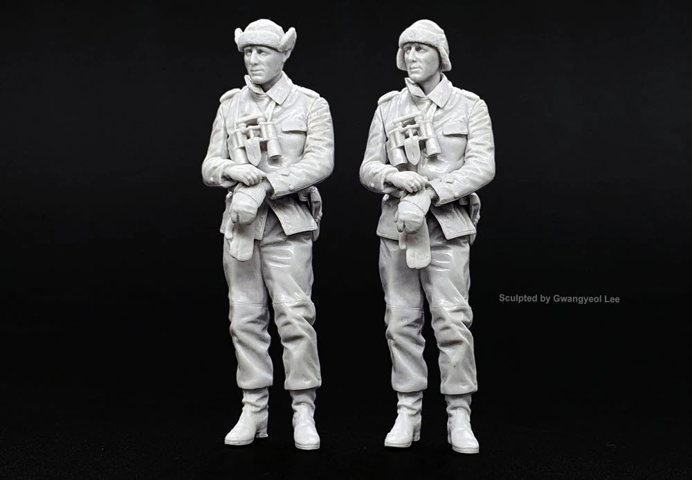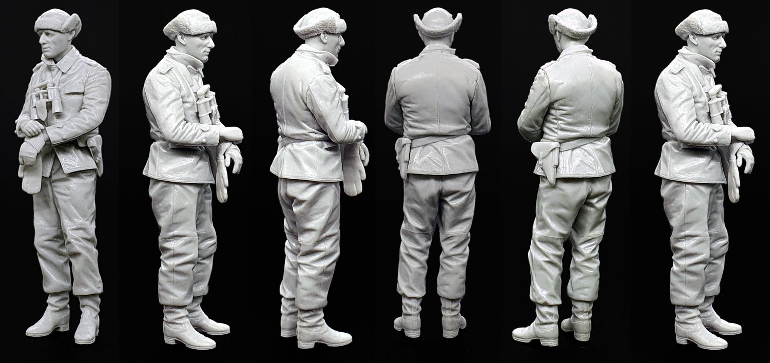 This figure is the fifth in the 12th SS 6 Kompanie series. The figure was inspired by archive photos. This soldier is wearing Italian army gloves that were purchased by the 1st SS from Italian shops in 1943 and worn frequently by 1st SS soldiers on the Eastern Front between 1943-1944. He wears the Kriegsmarine leather top, bottom and leather winter cap. During the Battle of Kharkov, in winter 1943, tankers from the 3rd SS Panzer Division wore this type of hat. The figure comes with two interchangeable head options: One with the ears flaps removed and one with them attached. He wears 7×10 Binoculars around his neck as an identifying feature. It is notable that the leather Kriegsmarine uniform, which was worn by many SS Panzers near the war’s end, can be used without modifications for the majority of SS Panzers. It is also suitable for use with the 1SS of the Eastern Front in the winter of 1943/44 or in the Battle of Ardenne in December 1944.