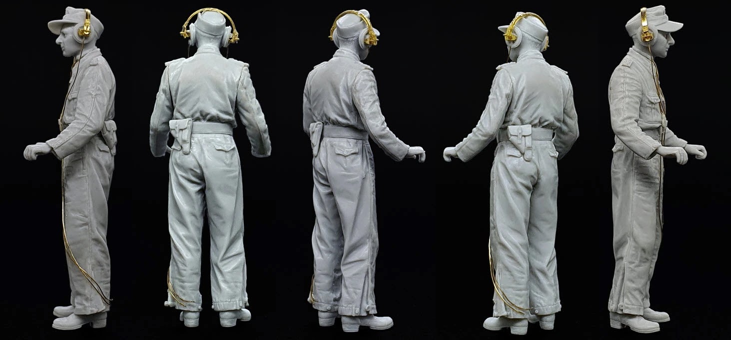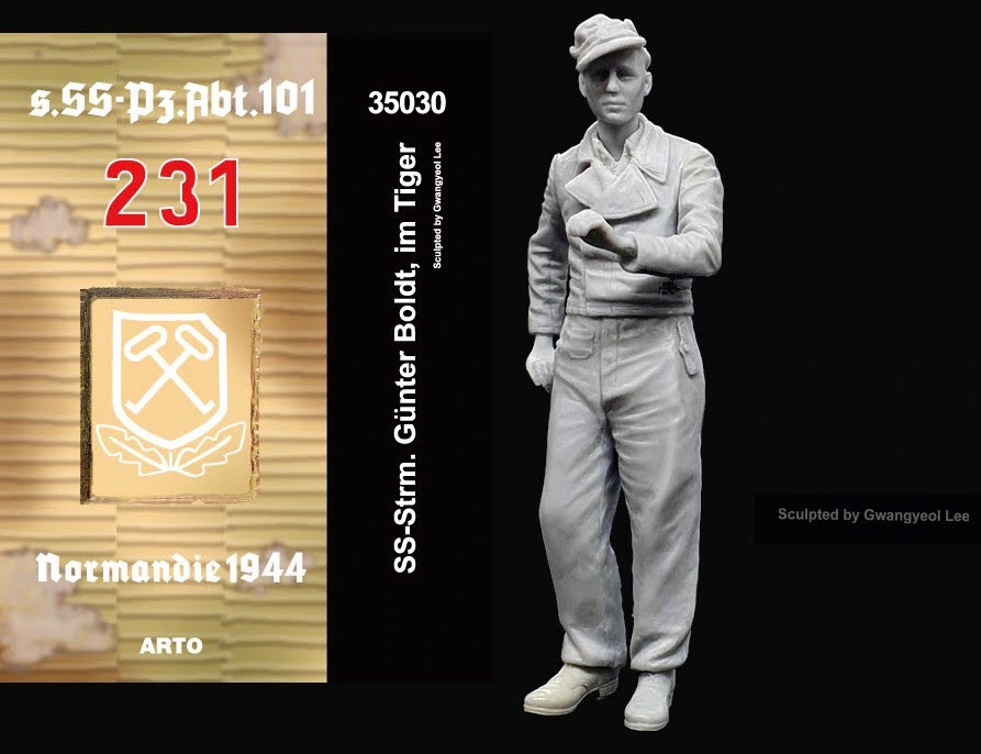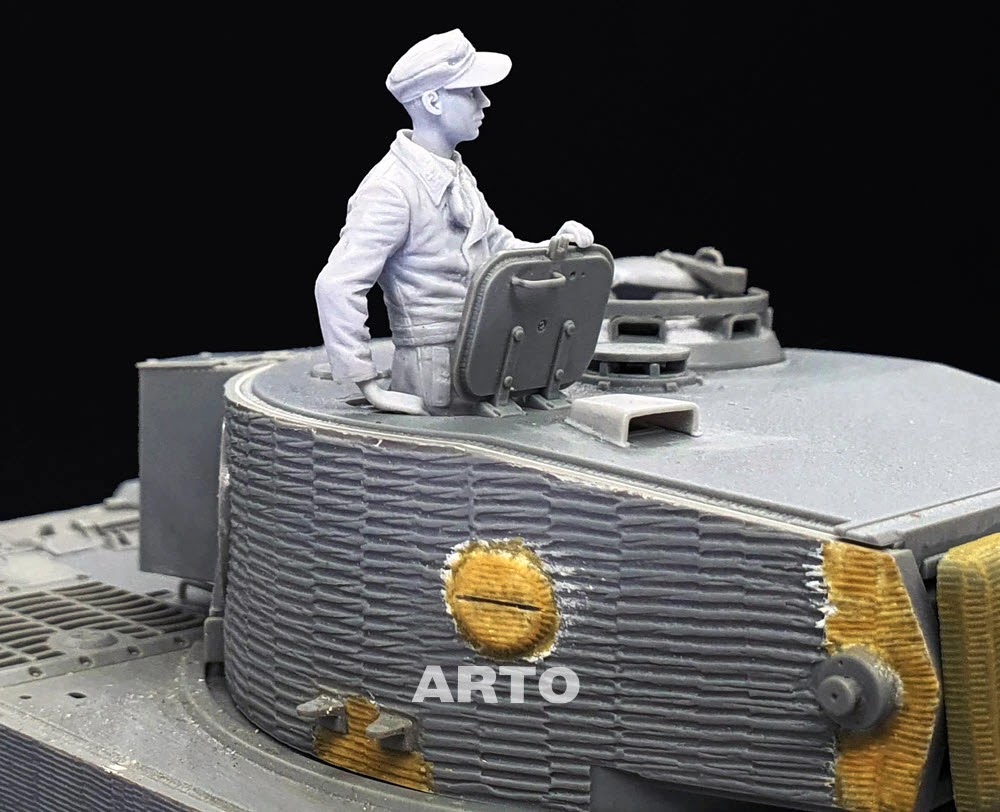 This figure depicts Gunter Boldt, a crew member who was on board the Tiger “231” with Michael Wittmann, as seen in a well-known newsreel from July. Gunter Boldt, a crew member who was on board the Tiger “231” with Michael Wittmann as seen in a well-known newsreel from July, tragically passed away soon after footage was shot at age 18. The figure is posed holding the Tiger-I loader hatch. This pose can be easily matched with not only SS-Panzer-Abteilung 101, but also other SS heavy tank battalions that operated Tiger-I and Tiger-II tanks. The figure’s pose shows Gunter holding onto the Tiger-I loader hatch, a common and versatile pose that can be easily matched with not only SS-Panzer-Abteilung 101, but also other SS heavy tank battalions that operated Tiger-I and Tiger-II tanks.
