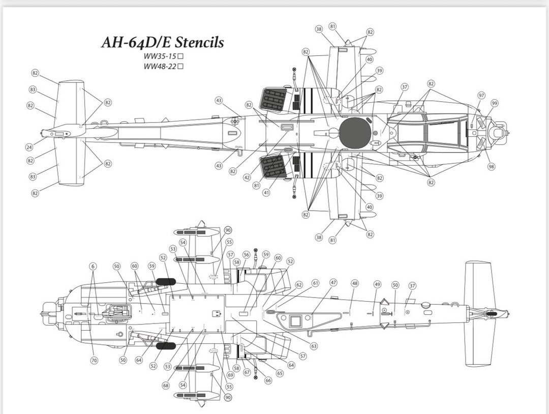 WW Markings and stencils for a single aircraft. Includes 22 Apaches in various Delta and Echo versions. The decals will be added to the Decals on Monday.