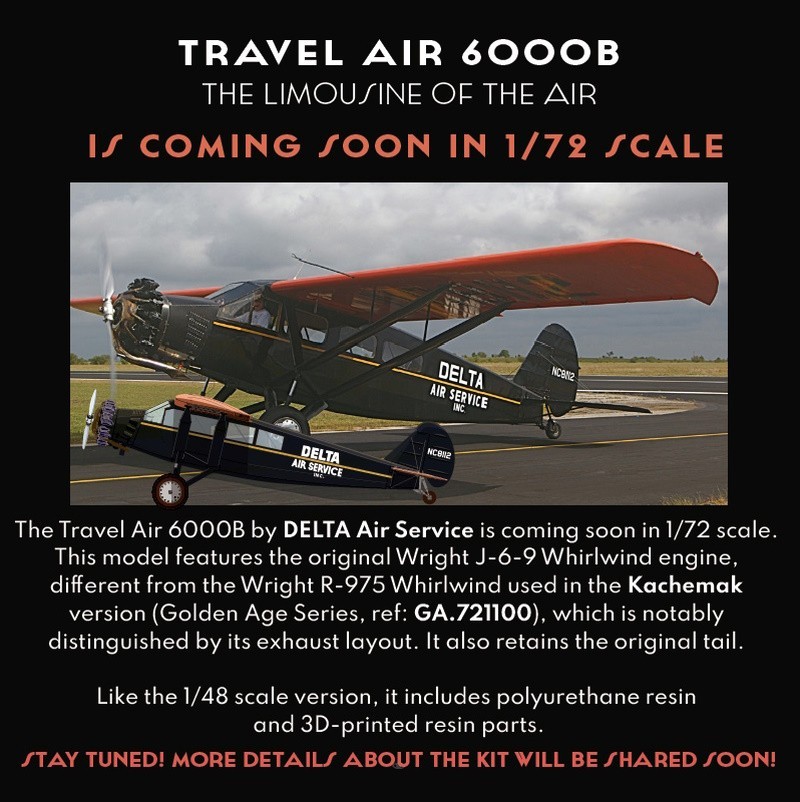 Last day to grab this offer! The Travel Air 6000B from DELTA Air Service is soon to be available in 1/72-scale, an eagerly anticipated model by collectors and enthusiasts alike. The Wright R-975 in the Travel Air 6000B is a civil version, which differs greatly from the Wright J-6-9. This model features the Wright J-6-9 engine. The latter model, also part of the Golden Age Series collection (ref: GA.721100), features a very distinct exhaust configuration that gives it a unique appearance.