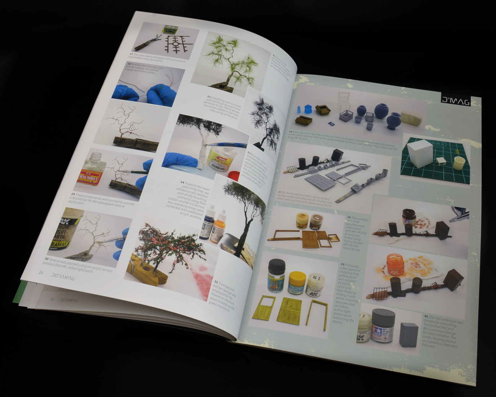 Toshihiro takes us through the building of the boat, where he shows the extras and corrections added ot the kit (great for the rest of us to copy) and the base with the waves which can make or break a scene like this. This article is a great way to show and explain the wash of water and figures that were added to the kit. In a dramatic scene, we then sample “Counter Attack on Normandy”, by Jiasheng. The Panther is navigating through the narrow streets of northern France, engaging with its main gun the enemy while infantry provide support. This article is fourteen pages long, and we get to see the build and painting of the Panther base kit. The 2021 piece by Greek modeller NikolasTriantafillou, The “Ave Maria’ Vignette is made with a 3D printed custom kit and shows moments of contemplation. It is full of subtle details. The groundwork of the ruin adds to the scene with mounds of rubble and debris, making this quite a beleivable scene.