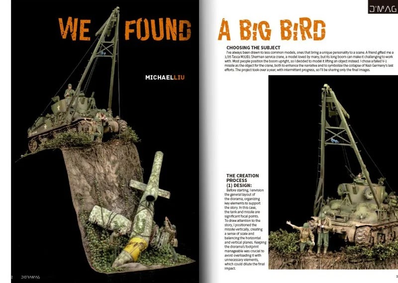 4. “We found a large bird.” This issue is entitled M-32 and V-1 Diorama by Michael Liu, in which allied soldiers attempt to recover a crashed V-1 Flying Bomb. Diorama kits, accessories and other products are featured in this section. “Are they beetles?” Ivan Momcilovic’s British Achilles diorama, in which he depicts a scene of British soldiers revealing a stash “Goliath”, RC mine/demolition vehicle. This month’s Dioramag showcase features Cong Wang. There are many great works that will inspire even the most novice modeller. Nikki Triantafillou’s “Pioneers of the Deep”. Nikki Triantafillou’s build and article is about the busy deck of a deep-sea dive. The early 20s scene really captures the atmosphere and shows off the technology available at the time. Riccardo casati’s “Argentan M5 Stuart” diorama. This tiny Stuart, seen in France in WWII during a battle on the side of a road, and its surroundings bring the reader right into the action. Christian Bruer’s “HMS Venomous”. Christian Bruer shows us not only how to create the ship, but also the water it sits in. This article shows how the water complements this small but detailed kit. Bernard Bassous’ “Wheeled Sniper AMX-10 Diorama”. This AMX-10 appears to be in the middle of a sedate training scene, as it passes an open gate. Mikaelterfors’ diorama “Need a Lift?” Hansa Brandenburg W.18 & Merchant Ship. This large diorama tells a story about a German floatplane pilot boarding a Swedish vessel during WWI. What is the story being told?