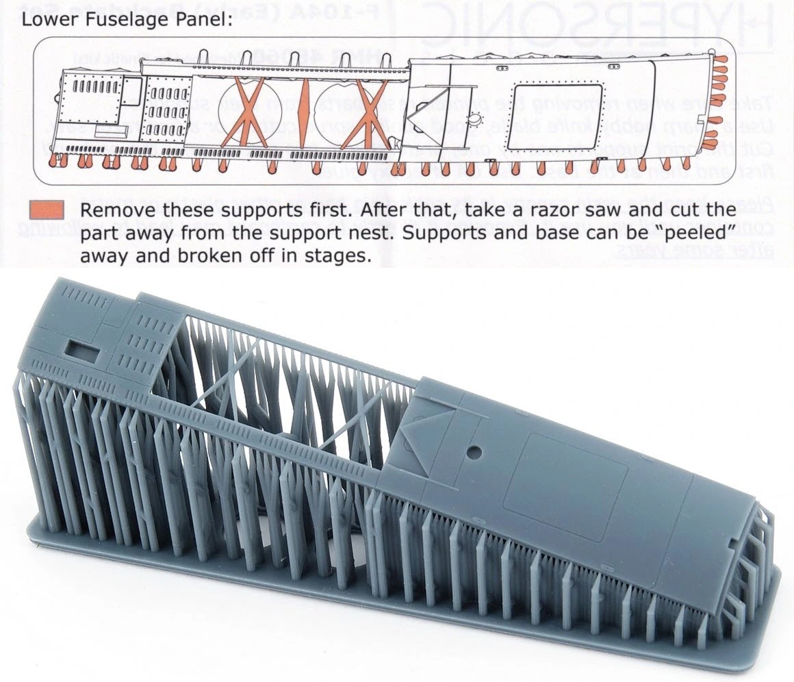 For my review I will work through all four instructions pages. We can then see the entire set and read the information provided by Hypersonic. Hypersonic provides very useful color drawings that describe the best way to use 3D printed components. You should start by removing the outermost parts, starting with the blue, followed by the green, and then the red. These parts, as you can tell from the picture of the canopy frame, are delicate and fine. Use good cutters to remove the support trees from the part. Be extra careful when handling the fuselage “L”, doublers. They are thin, long parts. Hypersonic has provided color-coded callouts to help you avoid damaging the parts. Remove the supports starting from the outer edge. It will make it easier to safely reach the inner supports. It’s time consuming work but slow and steady wins the race.