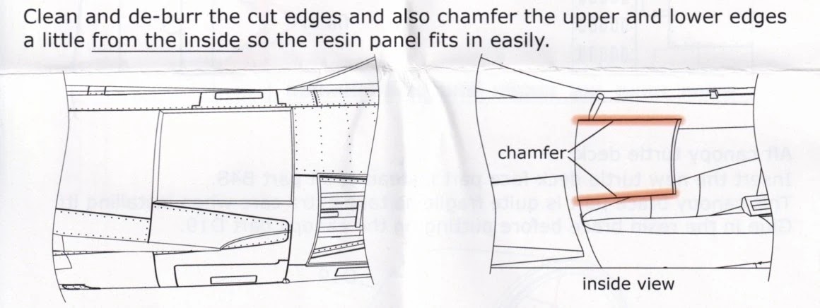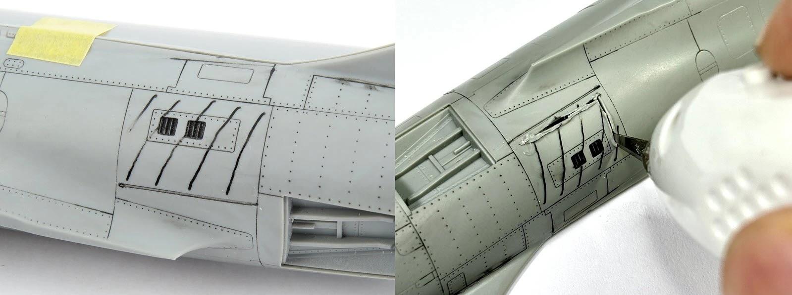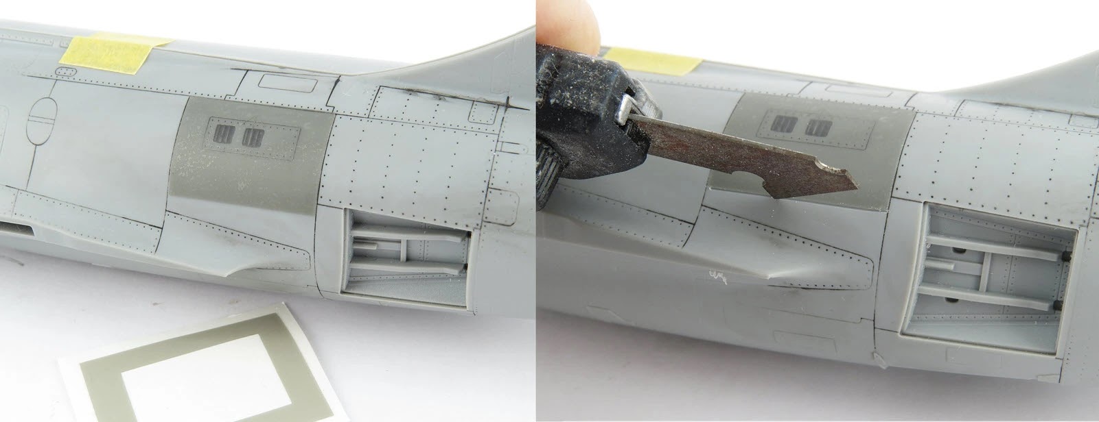 Hypersonic provide a vinyl template which you apply to the kit fuselage. You can use this to indicate the location of the lower cutting line on the resin insert panel. Other three cuts are made along the existing panel lines of the kit. You can use a scriber, like I did, or a pencil to draw along the lower edge of the template.