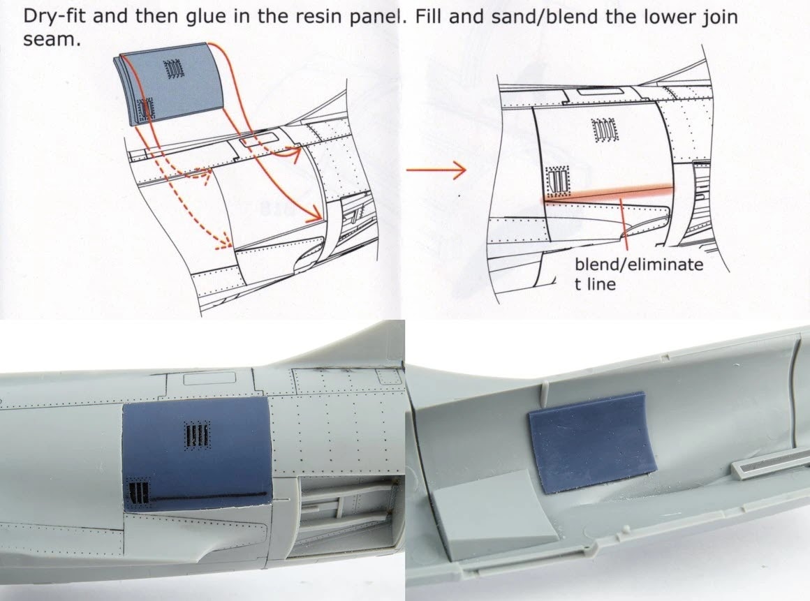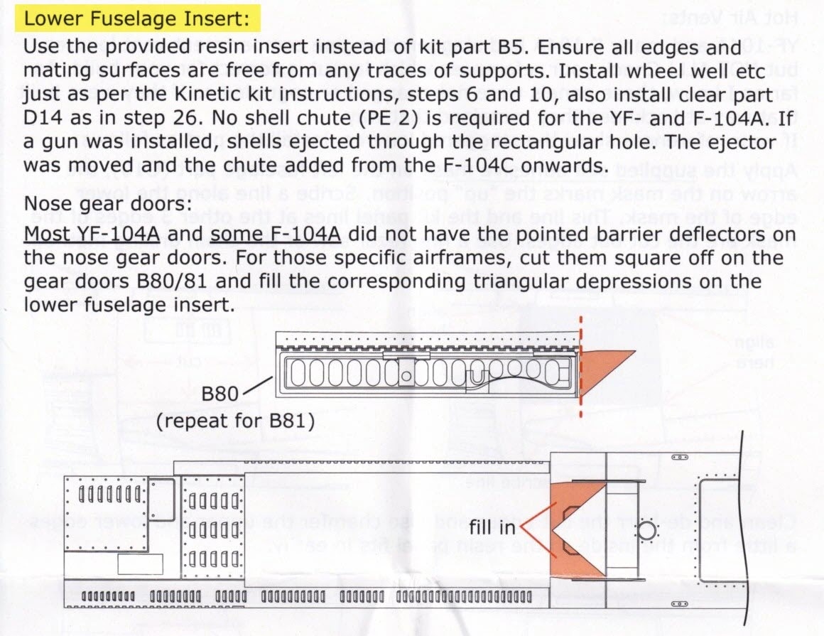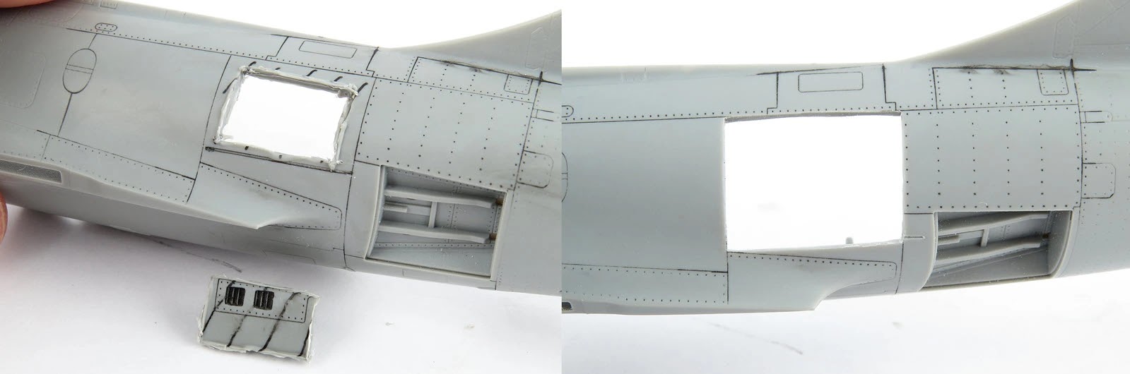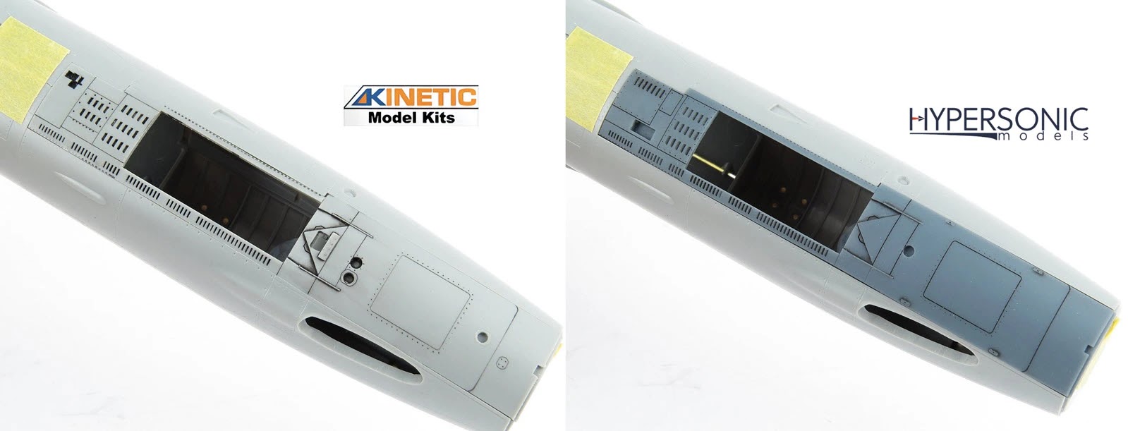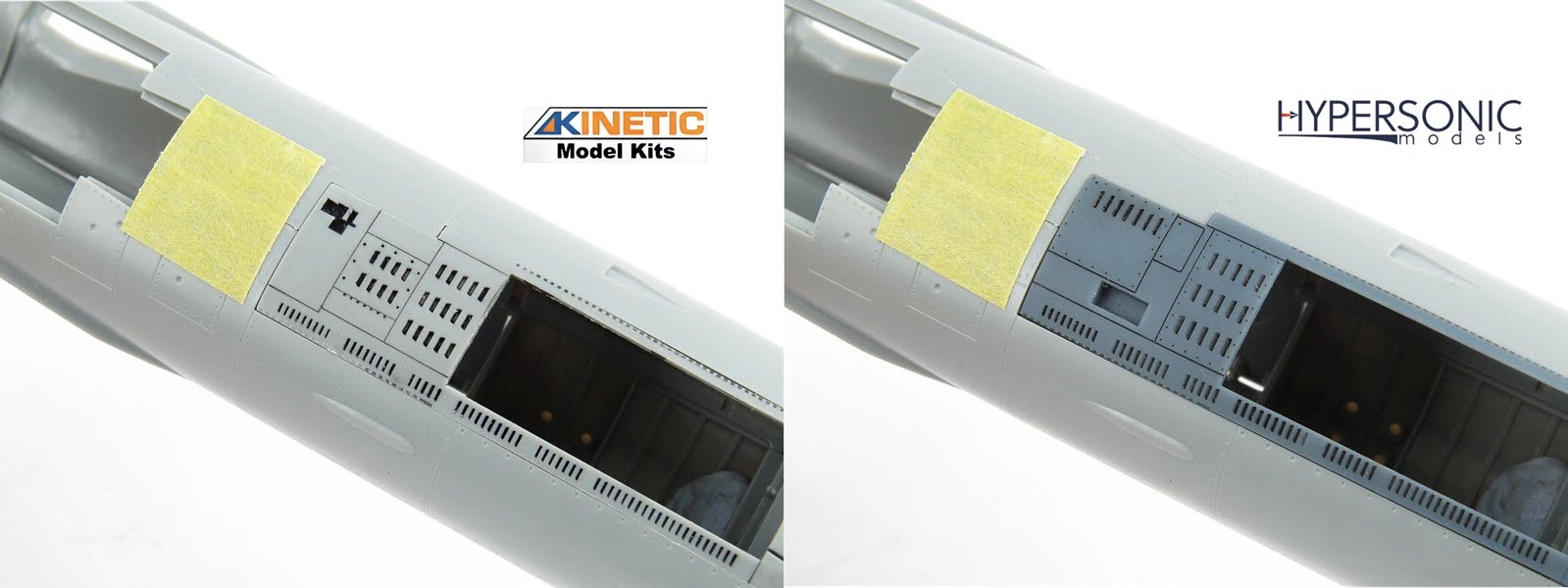 WARNING: THE SUPPLIED VINYL TEMPLATE IS TOO SMALL. This was a packing error and HYPERSONIC are aware of it. They will provide a corrected part if you contact them. The template is too small to cause any real harm. The template is 2mm larger than the model as shown below. You can now begin hacking the model. To avoid cutting incorrectly, I mark parts that need to be cut out. Remember the saying, “Measure once, cut twice”. It just so happens that I have an ultrasonic blade, which I use rarely but is ideal for cutting through the fuselage’s thick plastic. It vibrates at an ultrasonic rate, which allows the blade to easily cut plastic or resin with minimal force. After removing the middle of the panel with the ultrasonic blade, we will use sanding stick, files and sharp blades to remove all the remaining material up to the edge of the template. As per instructions, you will need to fill and smooth the lower cutline as it is not part of the natural panel. Hypersonic provides a drop-in replacement part for B5 in the kit. This is used to replace the lower fuselage. The Kinetic kit included the chute (which was added to the F-104C and later). As noted in the instructions for assembly, many YF-104As and F-104As do not have pointed barrier deflectors at the nose gear door. You will have to use the parts from the Kinetic kit to cover the holes on the fuselage. It is easy to see the differences in the resin and Hypersonic modified part. Kinetic’s plastic version has some detail, but it is nothing in comparison to the resin component. This is the direct replacement part for B48.