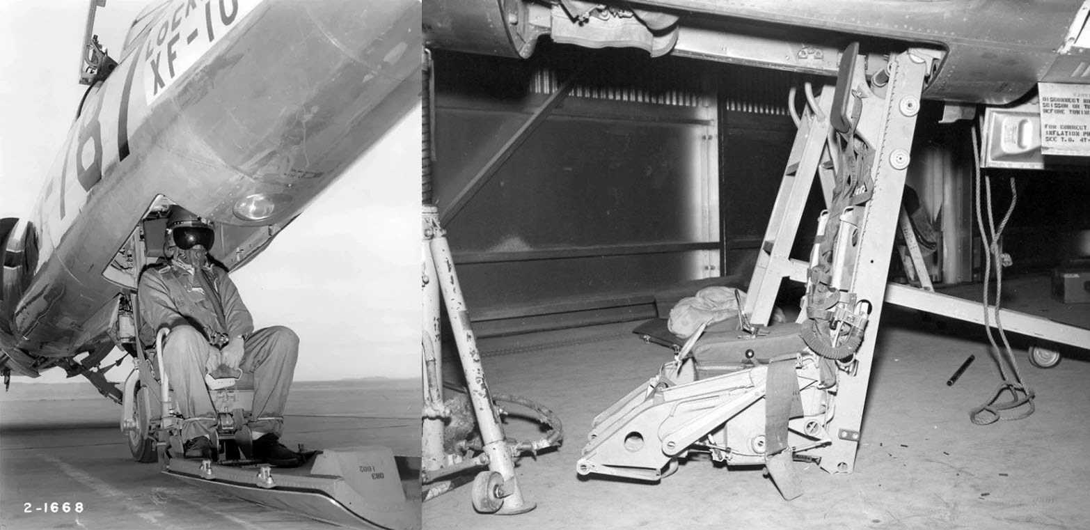 Stanley Aviation provided a solution with the Stanley C-1 Ejection Seat. The Stanley C-1 Ejection Seat fired downwards, saving crews from emergency situations in aircraft such as the F-104 or B-47. It had complex mechanisms including “spurs”, which were metal spikes on the heel of the boots of pilots, that would slot over the steel balls of the footrest (hence the “Cowboy'” nickname of F-104 Pilots). The balls attached to cables that kept the pilot’s feet in place during the ejection sequence.