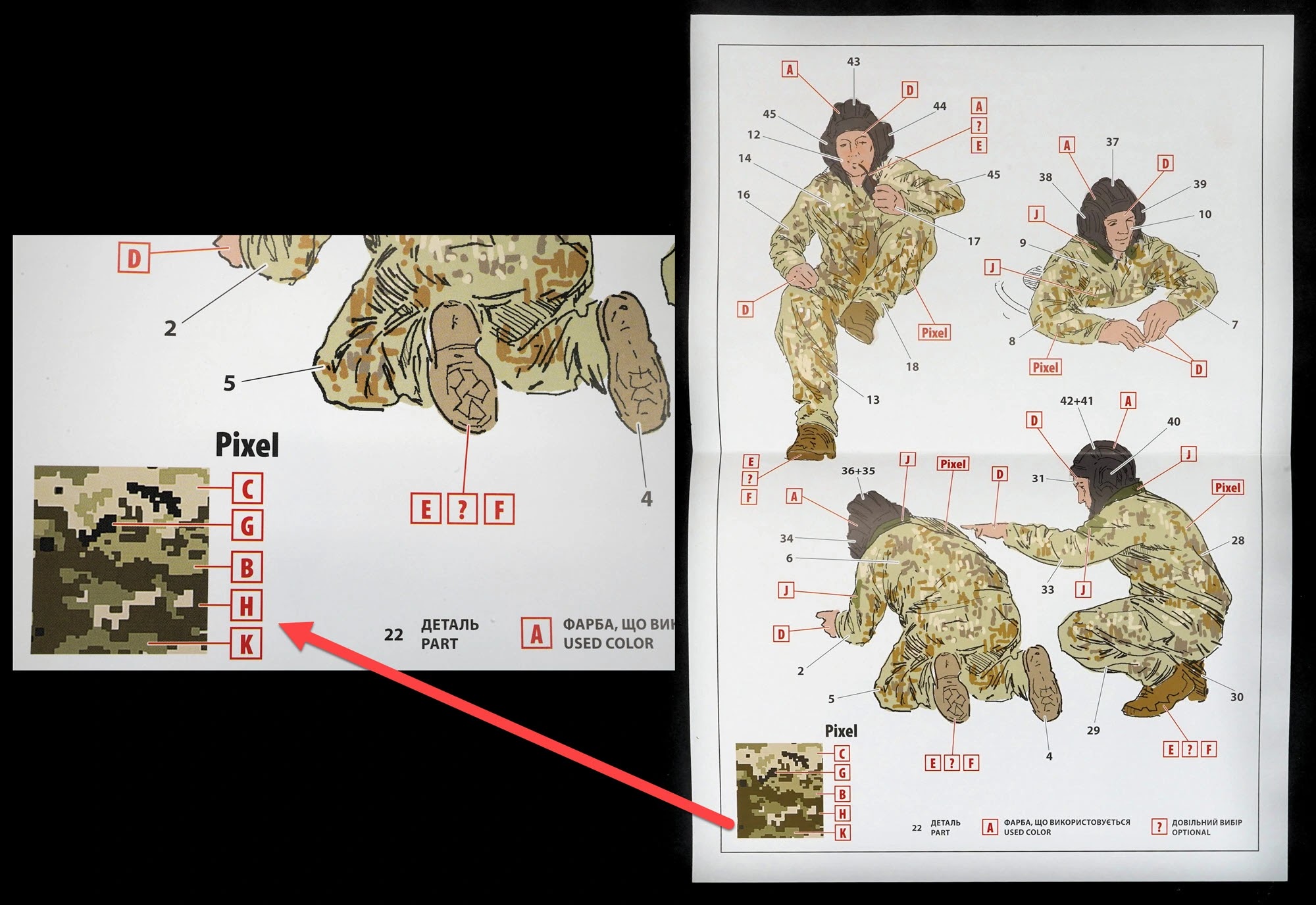 The simplified illustrations of the figures from the side of the box are included in a larger form on the instruction sheet, and a very basic ‘template’ for recreating the unique multi-cam pattern for the suits is suggested using combinations of 5 different colours.