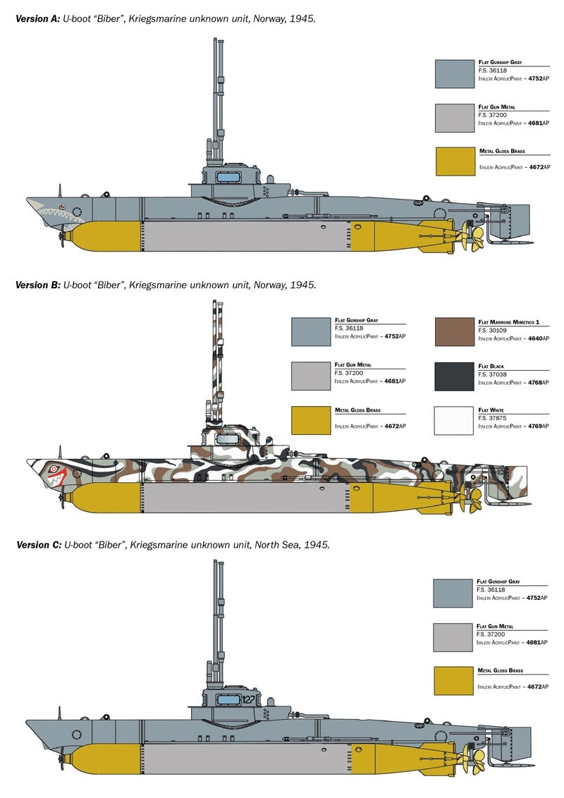 Dim. The “Biber”, the Kriegsmarine’s most famous “pocket submarine” during World War II, was a miniature submarine that measured 18,6 cm. Biber’s development was very rapid. The development of the Biber began in February, 1944. Six months later, first units had been launched. It was only 9 meters in length, but had a 240-kilometer range. The submarine could achieve a top speed of 6 knots on the surface and 5 knots underwater. It could have two externally mounted 530mm torpedoes or two mines. The marking options in this model are shown in the decals. From 1944 until the end of World War II, the Kriegsmarine received and deployed over 300 Bibers.