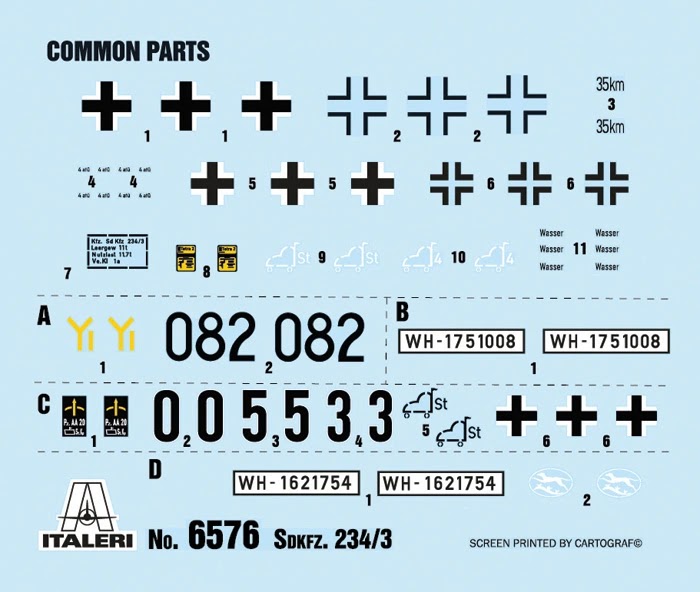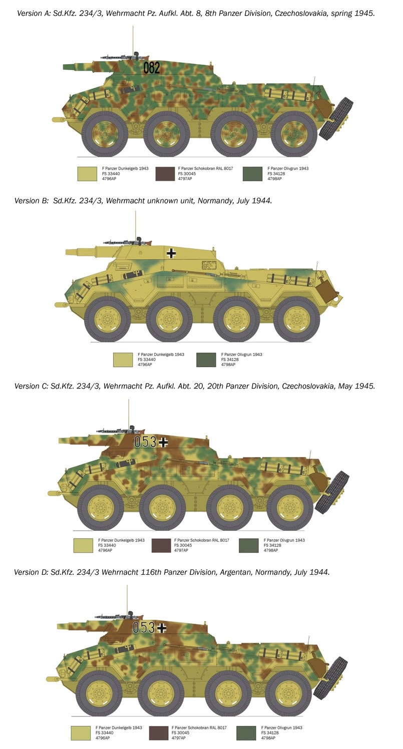 Dim. Dim. The German war industry produced the 234 series in the last phase of World War II. The vehicles were distinguished by their high-quality construction, which combined offensive capabilities, mobility and operational flexibility. This design was a perfect blend of protection and firepower on any terrain. It reflected the experience the Wehrmacht gained in the first years of World War II. The decals included in the kit were