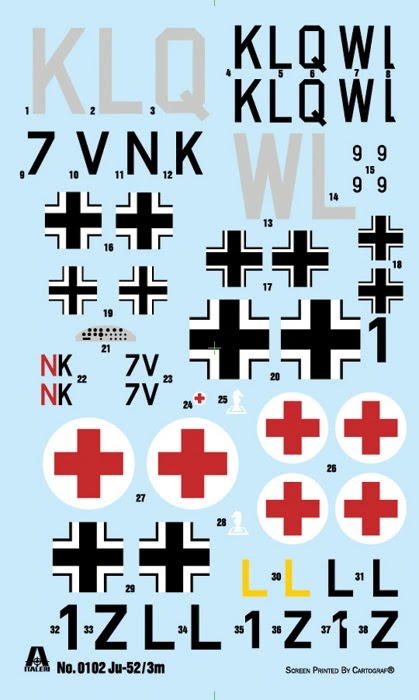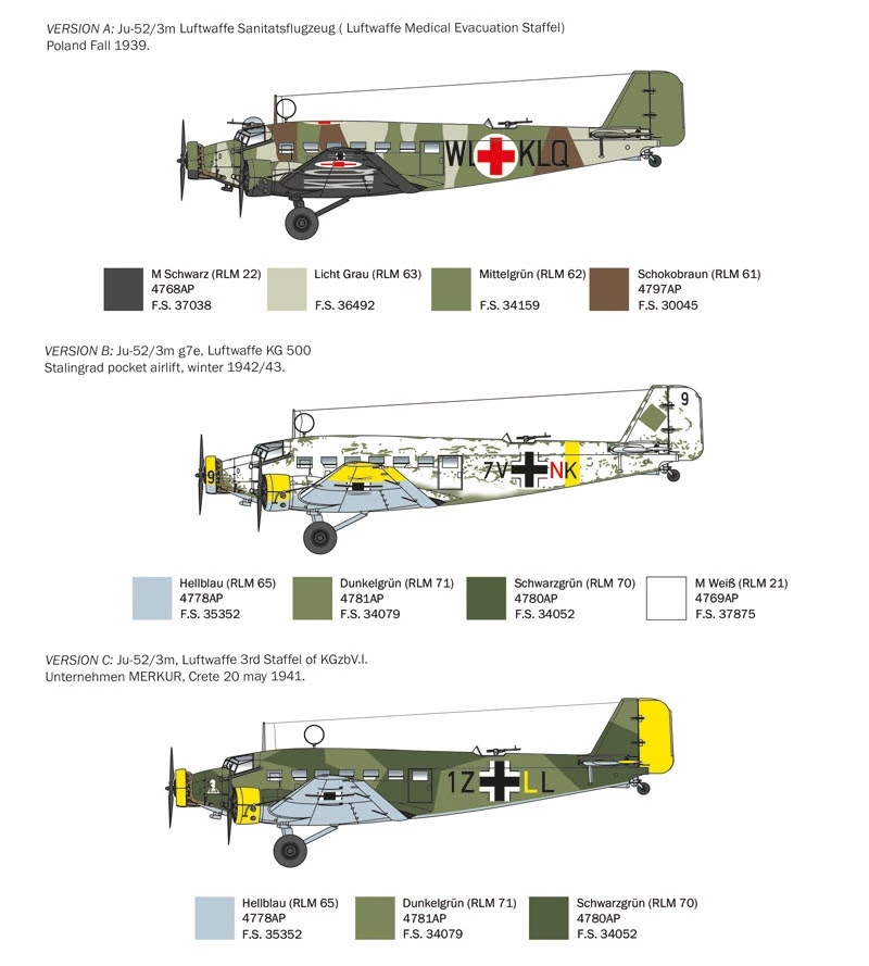 Model- Includes 3 different versions. The Junkers Ju-52/3m was distinguished by its distinctive three engine configuration, and corrugated fuselage panels. The marking options in this model kit