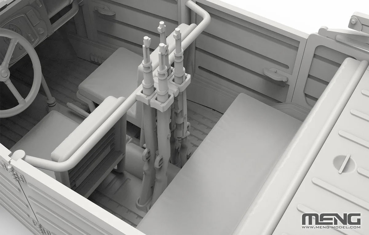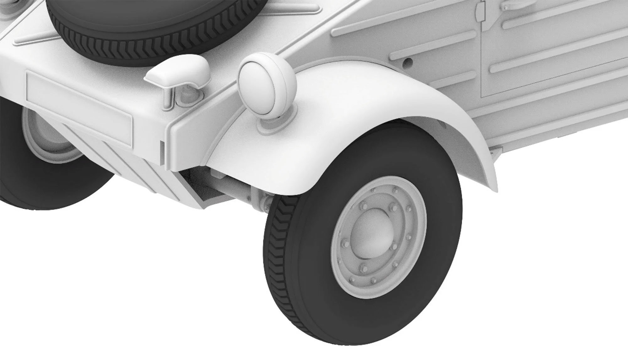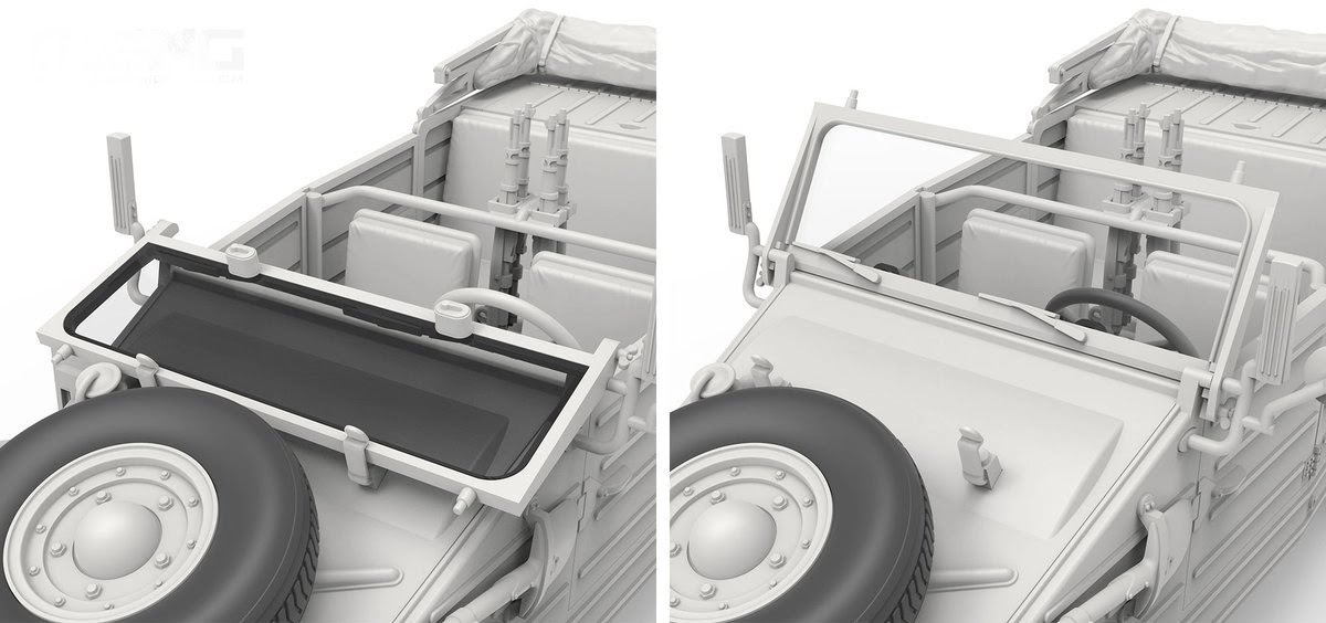the horn 01001010on early bucket cars was installed below the left rearview mirror, while later models had it moved to the front of the left fender. We have created two different mounting positions to meet the demands of modelers. You can choose either position based on your preference.01001010For the headlights, Meng will provide both transparent covers and light control covers. You can choose to build either version according to your preference.01001010We don’t know how this got through to the keeper, and you may well like vynil tyres, but we do not know why people keep on making them in their kit releases.01001010This kit includes a folded soft top designed by digital sculpting. Other details of the vehicle are accurately represented.01001010The front windshield can be assembled up or down, your choice…01001010The Pkw.K1 Typ82 features independent suspension and a rear-wheel drive system, with the front axle being a steering axle. The design of the model requires additional parts in order to reproduce the steering mechanism. The assembly will be extremely difficult, and small pieces may even break because of insufficient strength. Meng, having carefully considered the design, decided to abandon it. It features a snap-fit design.01001010The separate floor parts match the actual structure of the rails and is easier to paint.01001010Optional parts are included such as a Kar 98k rifle and extra fuel tanks. It features a simple snap-fit design.01001010The separate floor parts match the actual structure of the floor rails and is easier to paint.01001010Optional parts are included such as a Kar 98k rifle and extra fuel tanks.01001010The chassis has a three-stage disassembly design, reproducing the structure of the actual car.01001010This new kit from Meng is still in development so keep an eye out here, or on 01001010for more info on this new model01001010