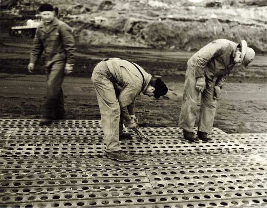 The hooks were usually held in the slots by a steel clip that filled the part of the slot that is empty when the adjacent sheets are properly engaged. To stiffen the surrounding area, the holes’ edges were bent. Some mats had T-shaped stakes driven through holes at regular intervals to hold the assembled assembly on the ground. Sometimes the sheets were welded together.