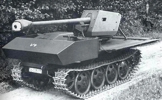 However, the PaK 40 auf RSO had an entirely new front end that left the driver completely exposed, with a wedge-shaped and armored cab to a maximum of 10 mm. PaK 40 ammunition was stored in the platform floor, which could be accessed via lifting panels. Crew members were only covered by the standard PaK-40 gun shield consisting of a 4-mm-thick plate, 25-mm air gap and a fourth 4-mm plate. A rear view of the PaK 40 on RSO. The pedestal mount for the gun can be seen. Its top road speed was only 11 mph. This made it less effective as a mobile destroyer. The PaK 40 on RSO, despite its promising concept was canceled in June of 1944 because of its low speed, noisy engines, reliability problems, as well the vulnerability to the crew. The photo shows how the machine is top-heavy and how it protects its crew. Selbstfahrlafette RSO