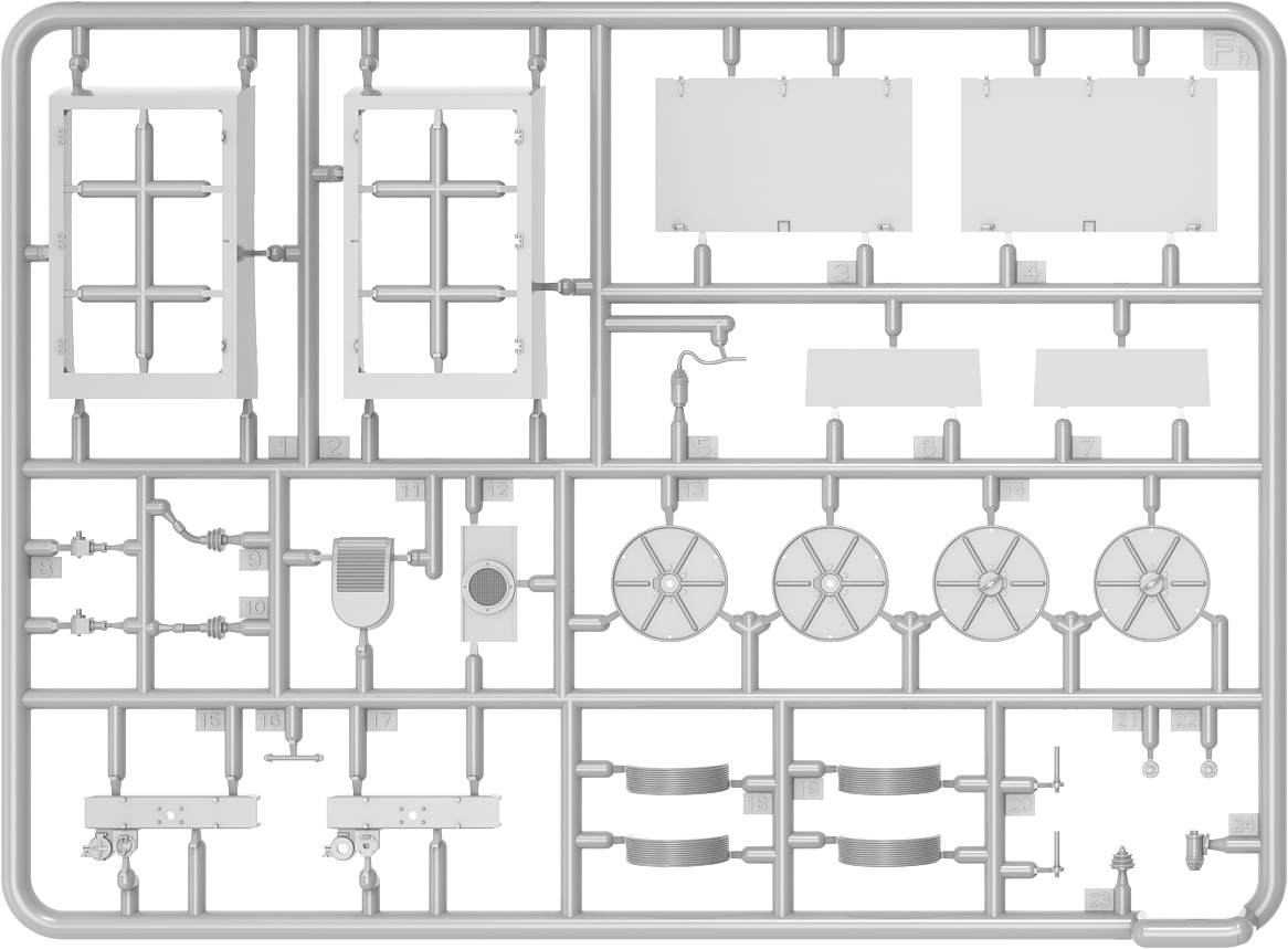kits. The radio, generator and other parts were carefully selected and placed on three separate sprues. They are all made of nice detail plastic and some parts have been made in photo-etch. The set includes three sprues in grey plastic: