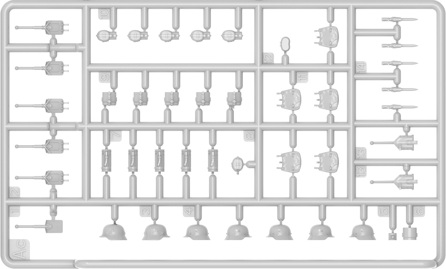 The second sprue comes filled with MG42 parts, with the gun, ammo belt, bipod in extended or folded status.01001010Lastly, a plethora of weapons and ammo – Mp-40s, Kar.98s, a Walther & flare pistols, pistols in pouches and open pouches to show a removed pistol, ammo for all of these, map pouches, knives and an ammo box. Three sprues contain almost everything that a German WWII Soldier would have in his pocket.