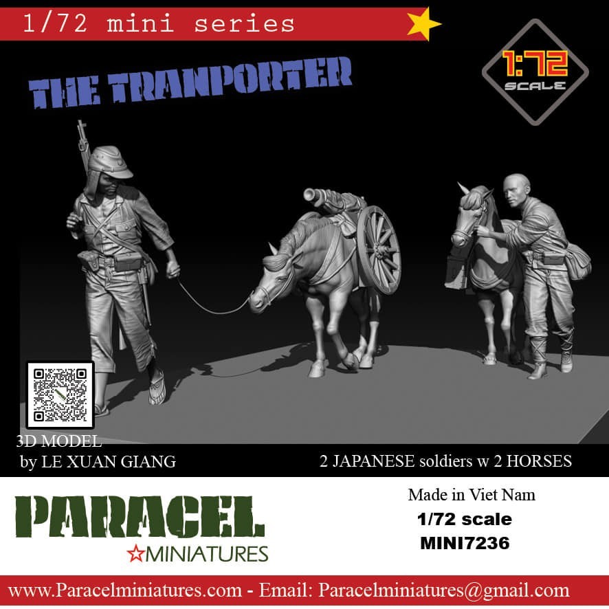 * MINI 7236 The Transporter ; 1/72 scale and contains 2 Global Conflict II Jap figures and a couple of closely loaded horses.