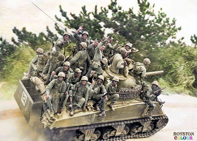 These US Marines hitch a ride on the back of a M4 Sherman tank