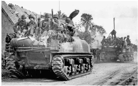 Below: This squad of infantrymen from Lieutenant General Courtney Hodges’ First Army caught a ride on a Sherman Tank as they moved through the French town of la Ferte-Mace on August 14, 1944. They were trying to catch the retreating Germans from the 5th Panzer Army and the Seventh Armies of the Falaise Pocket. After having defeated the German counterattack at Mortain on August 7, the American First and Third Armies swept around behind the enemy from the south-west and forced them to flee eastward to escape entrapment.