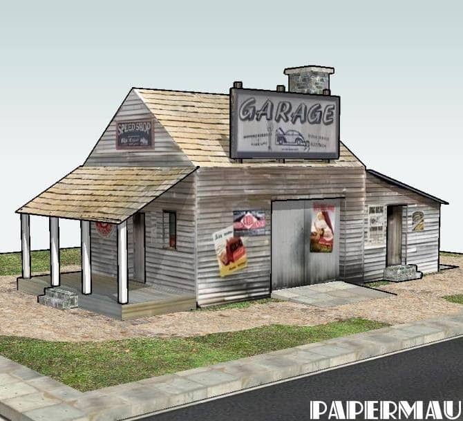 The Dirty Garage Miniature paper Model in HO scale by Gomanvongo via Hobby Talk