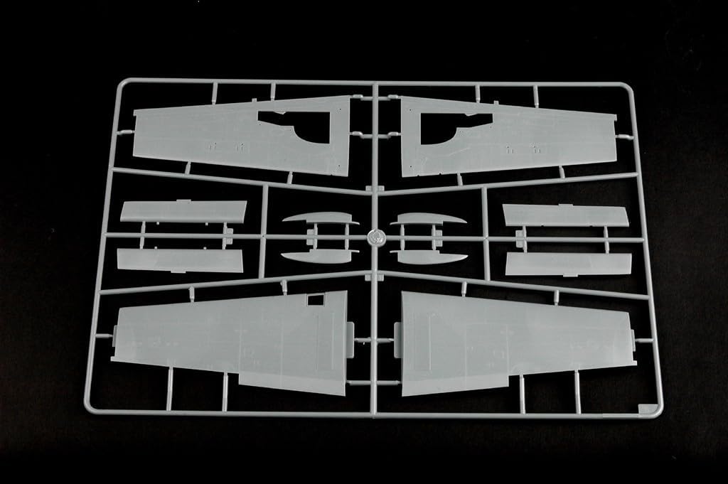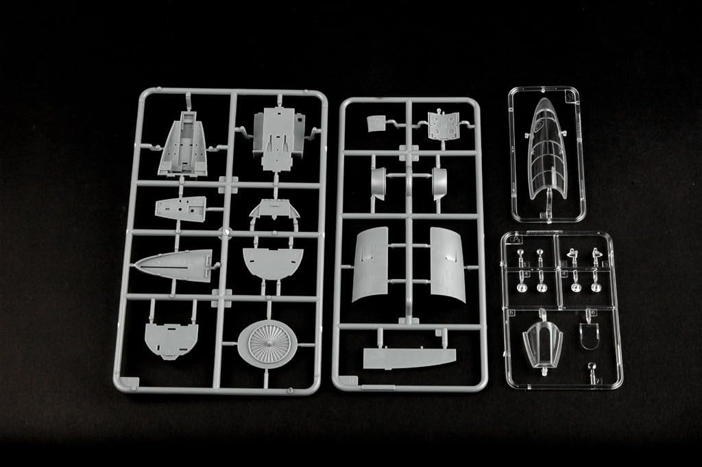 Kit features fine surface engravings, excellent cockpit (with choice of 2 ejection seats), well detailed landing gear and wheel wells, separate control surfaces, dropped flaps. Optional position perforated type speed brake. Exhaust pipe with turbine faces. 2-piece reinforced type canopy. Kit features fine surface engravings, excellent cockpit (with choice of 2 ejection seats), full nose gun bay interior, well detailed landing gear and wheel wells, separate control surfaces, dropped flaps, optional position perforated type speed brake, exhaust pipe with turbine faces, optional wingtip tanks, 2-piece reinforced type canopy, RATO bottles, vinyl tires, smooth white metal undercarriage struts and nose weights (pre-shaped to fit between gun bay and intake splitter).Also includes external stores – pylons with separate sway braces, 2 drop tanks and assorted bombs.