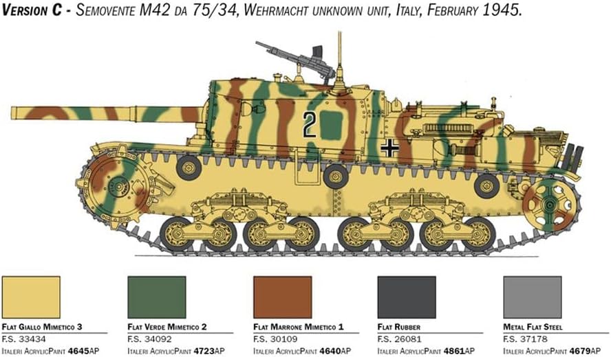 Self Propelled M42 75/34 Includes Super Decals for 6 Italy/Germany versions, Colour Instructions Contains photo-etched, metal bar, glueable rubber tracks. New Pieces Skills: 4 Dim. Model: 14.5 cm. / Dim. Box: 34.5 x 24.2 x 6 cm. Made in Italy