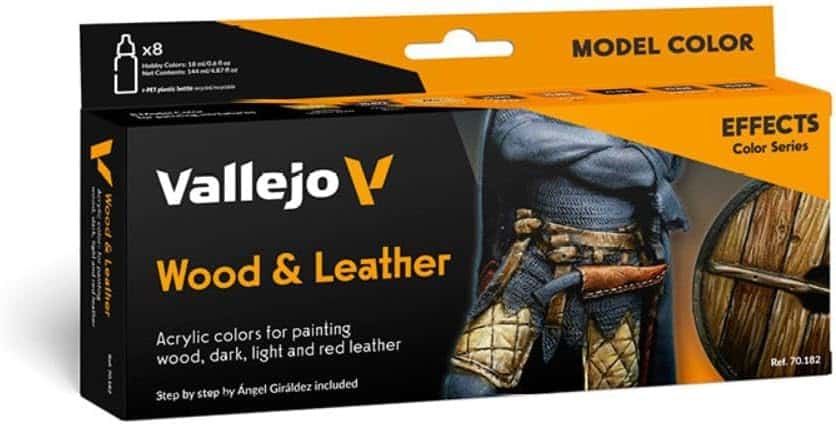 New Wood & Leather Set (8 colors) with special collaboration by Angel Giraldez #70182. Wood and leather textures are used in many medieval and contemporary miniatures. They are also found in Viking shields as well as gun barrels, fences, structures and dioramas. This set shows you how to achieve the various textures and tones of these surfaces. Each color was carefully chosen to provide maximum flexibility and versatility. From the warm mahogany tones to the deep browns and tones of aged leather. Set includes 8 bottles each containing 18 ml (0.60 fluid ounces). The set contains the following colors: 70.950 Black, 70.828 Mahogany Ink, 70.939 Smoke Ink. The consistency of these paints also allows for a uniform and smooth paint film that leaves no brush strokes. The line has more than 200 shades of color. Paints from the Model color range are known for excellent coverage, easy application and authentic results.