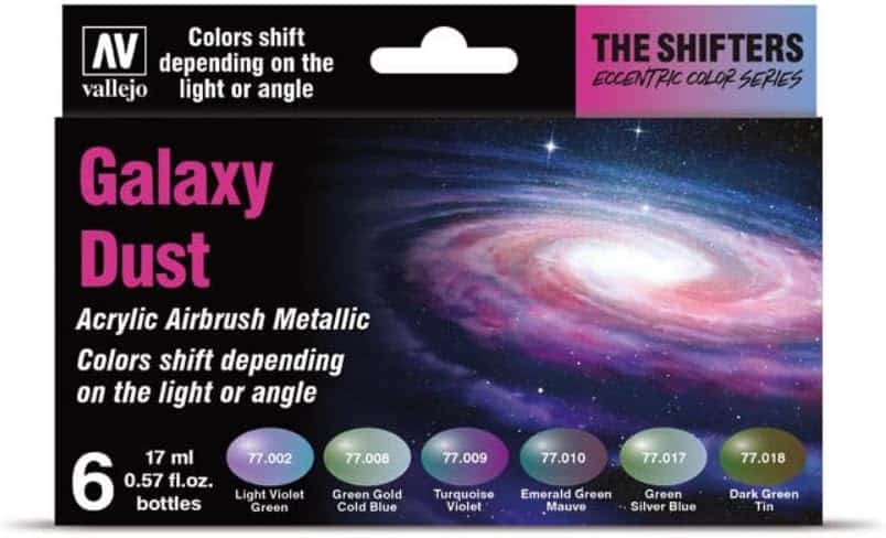 The Shifters is the first collection in the new Eccentric Color series. It’s a range of metallic acrylic airbrush colours that are ready to use. These colors have a metallic shimmer thanks to the multichromatic Eccentric Colours pigments. Their glass-like coating also acts as a prism. The color shift is visible in both low and high-gloss finishes, and under a variety lighting conditions. It is also enhanced when the flake is applied to a curved surface. The Shifters range is the first in the Eccentric Colours collection, a series of metallic acrylic airbrush colors. The Eccentric Colors multichromatic pigments used in the formulation of these colours give them an intense metallic tone enhanced by microcrystal-like particles that act as a refracting prism.FiguresDepending on the angle or the light reflected on the painted object, the colour will change in tone. The Shifters range of miniature paints is designed for fantasy and wargaming enthusiasts. They are composed of bright and vivid shades, which facilitate an intuitive and structured painting method, allowing an easy and effective chromatic choice to achieve figures with perfect light and shadow in fantasy and board game environments.The Shifters range contains a selection of water-based acrylic metallic airbrush colours, which are therefore non-flammable and solvent-free. The bottles are 17 ml./0.57fl.oz. The bottles have an eyedropper. For the best effects, shake the set well before using and apply thin layers.